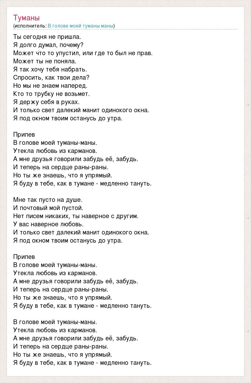 Ты сегодня не пришла. Я долго думал, почему? Может что то упустил, или где то был не прав. Может ты не поняла. Я так хочу тебя набрать. Спросить, как твои дела? Но мы не знаем наперед. Кто то трубку не возьмет. Я держу себя в руках. И только свет далекий манит одинокого окна. Я под окном твоим останусь до утра. Припев В голове моей туманы-маны. Утекла любовь из карманов. А мне друзья говорили забудь её, забудь. И теперь на сердце раны-раны. Но ты же знаешь, что я упрямый. Я буду в тебе, как в тумане - медленно тануть. Мне так пусто на душе. И почтовый мой пустой. Нет писем никаких, ты наверное с другим. У вас наверное любовь. И только свет далекий манит одинокого окна. Я под окном твоим останусь до утра. Припев В голове моей туманы-маны. Утекла любовь из карманов. А мне друзья говорили забудь её, забудь. И теперь на сердце раны-раны. Но ты же знаешь, что я упрямый. Я буду в тебе, как в тумане - медленно тануть. В голове моей туманы-маны. Утекла любовь из карманов. А мне друзья говорили забудь её, забудь. И теперь на сердце раны-раны. Но ты же знаешь, что я упрямый. Я буду в тебе, как в тумане - медленно тануть.