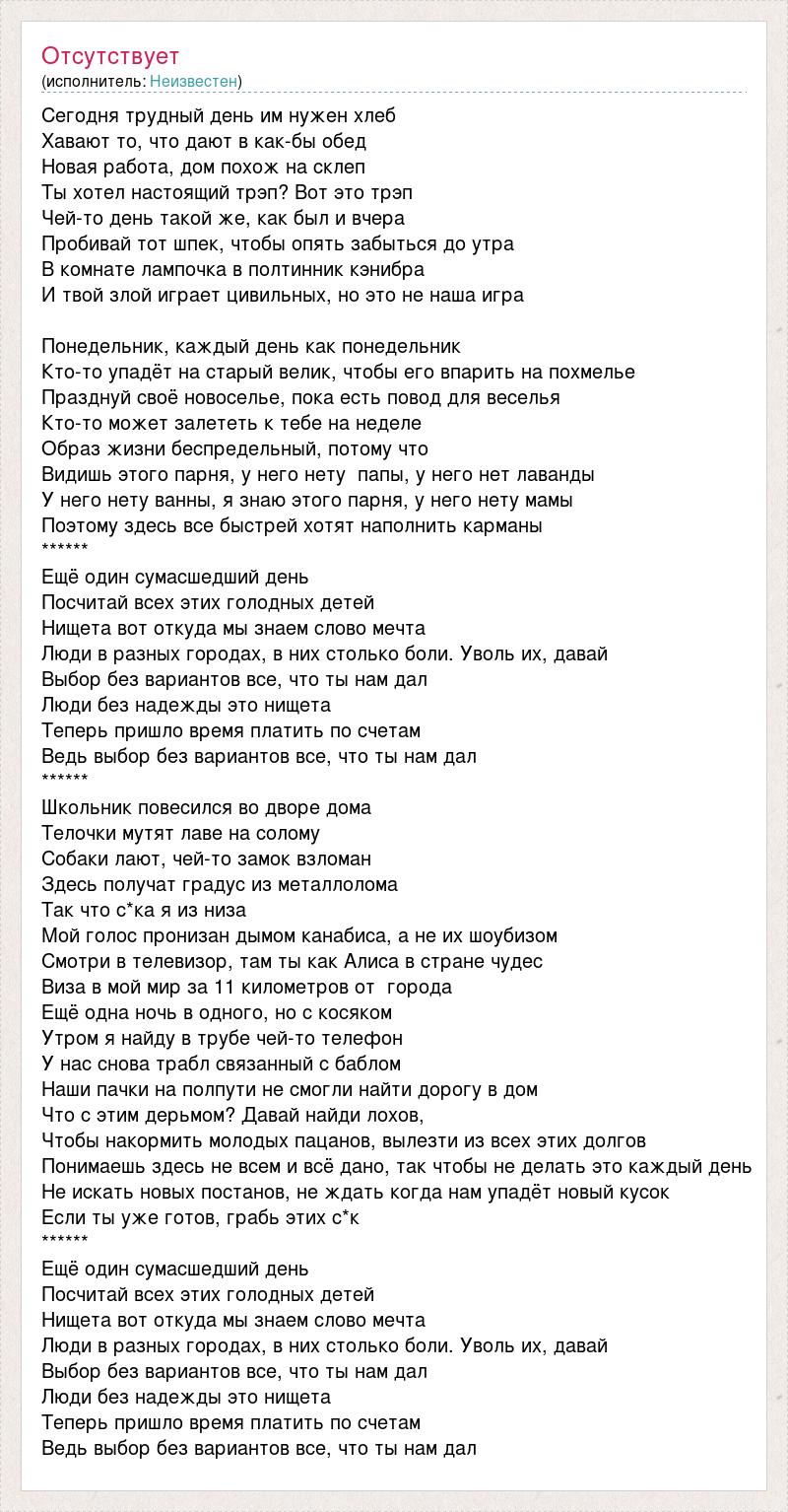 Сегодня трудный день им нужен хлеб Хавают то, что дают в как-бы обед Новая работа, дом похож на склеп Ты хотел настоящий трэп? Вот это трэп Чей-то день такой же, как был и вчера Пробивай тот шпек, чтобы опять забыться до утра В комнате лампочка в полтинник кэнибра И твой злой играет цивильных, но это не наша игра Понедельник, каждый день как понедельник Кто-то упадёт на старый велик, чтобы его впарить на похмелье Празднуй своё новоселье, пока есть повод для веселья Кто-то может залететь к тебе на неделе Образ жизни беспредельный, потому что Видишь этого парня, у него нету папы, у него нет лаванды У него нету ванны, я знаю этого парня, у него нету мамы Поэтому здесь все быстрей хотят наполнить карманы ****** Ещё один сумасшедший день Посчитай всех этих голодных детей Нищета вот откуда мы знаем слово мечта Люди в разных городах, в них столько боли. Уволь их, давай Выбор без вариантов все, что ты нам дал Люди без надежды это нищета Теперь пришло время платить по счетам Ведь выбор без вариантов все, что ты нам дал ****** Школьник повесился во дворе дома Телочки мутят лаве на солому Собаки лают, чей-то замок взломан Здесь получат градус из металлолома Так что с*ка я из низа Мой голос пронизан дымом канабиса, а не их шоубизом Смотри в телевизор, там ты как Алиса в стране чудес Виза в мой мир за 11 километров от города Ещё одна ночь в одного, но с косяком Утром я найду в трубе чей-то телефон У нас снова трабл связанный с баблом Наши пачки на полпути не смогли найти дорогу в дом Что с этим дерьмом? Давай найди лохов, Чтобы накормить молодых пацанов, вылезти из всех этих долгов Понимаешь здесь не всем и всё дано, так чтобы не делать это каждый день Не искать новых постанов, не ждать когда нам упадёт новый кусок Если ты уже готов, грабь этих с*к ****** Ещё один сумасшедший день Посчитай всех этих голодных детей Нищета вот откуда мы знаем слово мечта Люди в разных городах, в них столько боли. Уволь их, давай Выбор без вариантов все, что ты нам дал Люди без надежды это нищета Теперь пришло время платить по счетам Ведь выбор без вариантов все, что ты нам дал