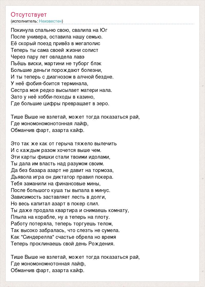 Покинула спальню свою, свалила на Юг После универа, оставила нашу семью. Её скорый поезд привёз в мегаполис Теперь ты сама своей жизни солист Через пару лет овладела лавэ Пьёшь виски, мартини не туборг блэк Большие деньги порождают болезни, И ты теперь с диагнозом в алчной бездне. У неё фобия-боится терминала, Сестра моя редко высылает матери нала. Зато у неё хобби-походы в казино, Где большие цифры превращает в зеро. Тише Выше не взлетай, может тогда показаться рай, Где мономономонотонная лайф, Обманчив фарт, азарта кайф. Это так же как от герыча тяжело вылечить И с каждым разом хочется выше чем. Эти карты фишки стали твоими идолами, Ты дала им власть над разумом своим. Да без базара азарт не давит на тормоза, Дьявола игра он диктатор правил покера. Тебя заманили на финансовые мины, После большого куша ты выпала в минус. Зависимость заставляет лесть в долги, Но весь капитал азарт в покер слил. Ты даже продала квартира и снимаешь комнату, Плыла на корабле, ну а теперь на плоту. Работу потеряла, теперь торгуешь телом, Так высоко забралась, что слезть не сумела. Как "Синдерелла" счастье обрела но время Теперь проклинаешь свой день Рождения. Тише Выше не взлетай, может тогда показаться рай, Где мономономнотонная лайф, Обманчив фарт, азарта кайф.