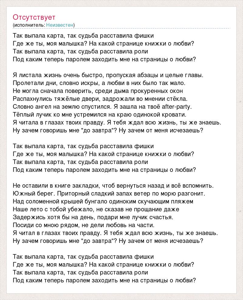 Так выпала карта, так судьба расставила фишки Где же ты, моя малышка? На какой странице книжки о любви? Так выпала карта, так судьба расставила роли Под каким теперь паролем заходить мне на страницы о любви? Я листала жизнь очень быстро, пропуская абзацы и целые главы. Пролетали дни, словно искры, а любви в них было так мало. Не могла сначала поверить, среди дыма прокуренных окон Распахнулись тяжёлые двери, задрожали во мнении стёкла. Словно ангел на землю спустился. Я зашла на твоё after-party. Тёплый лучик ко мне устремился на краю одинокой кровати. Я читала в глазах твоих правду. Я тебя ждал всю жизнь, ты же знаешь. Ну зачем говоришь мне "до завтра"? Ну зачем от меня исчезаешь? Так выпала карта, так судьба расставила фишки Где же ты, моя малышка? На какой странице книжки о любви? Так выпала карта, так судьба расставила роли Под каким теперь паролем заходить мне на страницы о любви? Не оставили в книге закладки, чтоб вернуться назад и всё вспомнить. Южный берег. Приторный сладкий запах ветер по морю разгонит. Над соломенной крышей бунгало одиноким скучающим пляжем Наше лето с тобой убежало, не сказав не прощание даже Задержись хотя бы на день, подари мне лучик счастья. Посиди со мною рядом, не дели любовь на части. Я читал в глазах твоих правду. Я тебя ждал всю жизнь, ты же знаешь. Ну зачем говоришь мне "до завтра"? Ну зачем от меня исчезаешь? Так выпала карта, так судьба расставила фишки Где же ты, моя малышка? На какой странице книжки о любви? Так выпала карта, так судьба расставила роли Под каким теперь паролем заходить мне на страницы о любви?