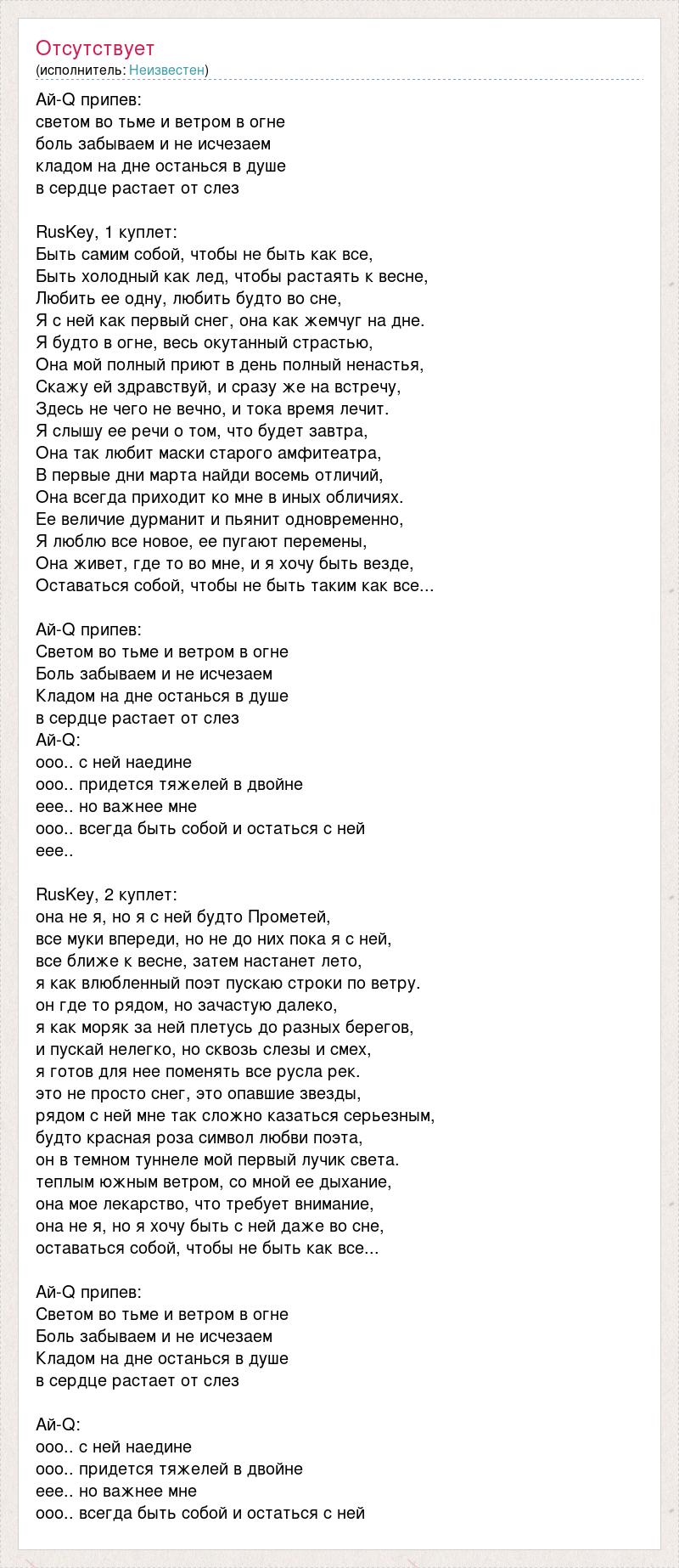 Ай-Q припев: светом во тьме и ветром в огне боль забываем и не исчезаем кладом на дне останься в душе в сердце растает от слез RusKey, 1 куплет: Быть самим собой, чтобы не быть как все, Быть холодный как лед, чтобы растаять к весне, Любить ее одну, любить будто во сне, Я с ней как первый снег, она как жемчуг на дне. Я будто в огне, весь окутанный страстью, Она мой полный приют в день полный ненастья, Скажу ей здравствуй, и сразу же на встречу, Здесь не чего не вечно, и тока время лечит. Я слышу ее речи о том, что будет завтра, Она так любит маски старого амфитеатра, В первые дни марта найди восемь отличий, Она всегда приходит ко мне в иных обличиях. Ее величие дурманит и пьянит одновременно, Я люблю все новое, ее пугают перемены, Она живет, где то во мне, и я хочу быть везде, Оставаться собой, чтобы не быть таким как все... Ай-Q припев: Светом во тьме и ветром в огне Боль забываем и не исчезаем Кладом на дне останься в душе в сердце растает от слез Ай-Q: ооо.. с ней наедине ооо.. придется тяжелей в двойне еее.. но важнее мне ооо.. всегда быть собой и остаться с ней еее.. RusKey, 2 куплет: она не я, но я с ней будто Прометей, все муки впереди, но не до них пока я с ней, все ближе к весне, затем настанет лето, я как влюбленный поэт пускаю строки по ветру. он где то рядом, но зачастую далеко, я как моряк за ней плетусь до разных берегов, и пускай нелегко, но сквозь слезы и смех, я готов для нее поменять все русла рек. это не просто снег, это опавшие звезды, рядом с ней мне так сложно казаться серьезным, будто красная роза символ любви поэта, он в темном туннеле мой первый лучик света. теплым южным ветром, со мной ее дыхание, она мое лекарство, что требует внимание, она не я, но я хочу быть с ней даже во сне, оставаться собой, чтобы не быть как все... Ай-Q припев: Светом во тьме и ветром в огне Боль забываем и не исчезаем Кладом на дне останься в душе в сердце растает от слез Ай-Q: ооо.. с ней наедине ооо.. придется тяжелей в двойне еее.. но важнее мне ооо.. всегда быть собой и остаться с ней