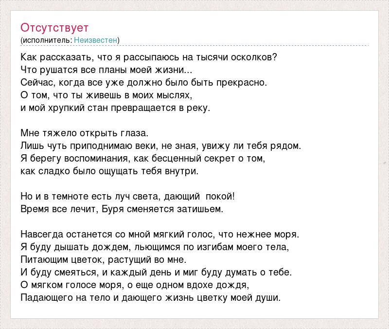 Как рассказать, что я рассыпаюсь на тысячи осколков? Что рушатся все планы моей жизни... Сейчас, когда все уже должно было быть прекрасно. О том, что ты живешь в моих мыслях, и мой хрупкий стан превращается в реку. Мне тяжело открыть глаза. Лишь чуть приподнимаю веки, не зная, увижу ли тебя рядом. Я берегу воспоминания, как бесценный секрет о том, как сладко было ощущать тебя внутри. Но и в темноте есть луч света, дающий покой! Время все лечит, Буря сменяется затишьем. Навсегда останется со мной мягкий голос, что нежнее моря. Я буду дышать дождем, льющимся по изгибам моего тела, Питающим цветок, растущий во мне. И буду смеяться, и каждый день и миг буду думать о тебе. О мягком голосе моря, о еще одном вдохе дождя, Падающего на тело и дающего жизнь цветку моей души.