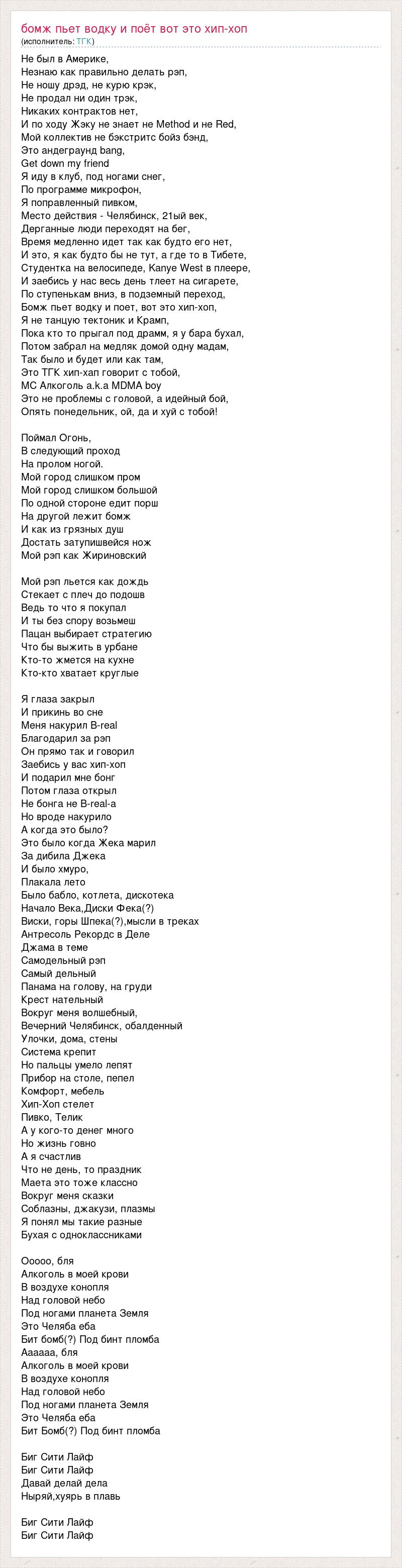 Не был в Америке, Незнаю как правильно делать рэп, Не ношу дрэд, не курю крэк, Не продал ни один трэк, Никаких контрактов нет, И по ходу Жэку не знает не Method и не Red, Мой коллектив не бэкстритс бойз бэнд, Это андеграунд bang, Get down my friend Я иду в клуб, под ногами снег, По программе микрофон, Я поправленный пивком, Место действия - Челябинск, 21ый век, Дерганные люди переходят на бег, Время медленно идет так как будто его нет, И это, я как будто бы не тут, а где то в Тибете, Студентка на велосипеде, Kanye West в плеере, И заебись у нас весь день тлеет на сигарете, По ступенькам вниз, в подземный переход, Бомж пьет водку и поет, вот это хип-хоп, Я не танцую тектоник и Крамп, Пока кто то прыгал под драмм, я у бара бухал, Потом забрал на медляк домой одну мадам, Так было и будет или как там, Это ТГК хип-хап говорит с тобой, MC Алкоголь a.k.a MDMA boy Это не проблемы с головой, а идейный бой, Опять понедельник, ой, да и хуй с тобой! Поймал Огонь, В следующий проход На пролом ногой. Мой город слишком пром Мой город слишком большой По одной стороне едит порш На другой лежит бомж И как из грязных душ Достать затупишвейся нож Мой рэп как Жириновский Мой рэп льется как дождь Стекает с плеч до подошв Ведь то что я покупал И ты без спору возьмеш Пацан выбирает стратегию Что бы выжить в урбане Кто-то жмется на кухне Кто-кто хватает круглые Я глаза закрыл И прикинь во сне Меня накурил B-real Благодарил за рэп Он прямо так и говорил Заебись у вас хип-хоп И подарил мне бонг Потом глаза открыл Не бонга не B-real-а Но вроде накурило А когда это было? Это было когда Жека марил За дибила Джека И было хмуро, Плакала лето Было бабло, котлета, дискотека Начало Века,Диски Фека(?) Виски, горы Шпека(?),мысли в треках Антресоль Рекордс в Деле Джама в теме Самодельный рэп Самый дельный Панама на голову, на груди Крест нательный Вокруг меня волшебный, Вечерний Челябинск, обалденный Улочки, дома, стены Система крепит Но пальцы умело лепят Прибор на столе, пепел Комфорт, мебель Хип-Хоп стелет Пивко, Телик А у кого-то денег много Но жизнь говно А я счастлив Что не день, то праздник Маета это тоже классно Вокруг меня сказки Соблазны, джакузи, плазмы Я понял мы такие разные Бухая с одноклассниками Ооооо, бля Алкоголь в моей крови В воздухе конопля Над головой небо Под ногами планета Земля Это Челяба еба Бит бомб(?) Под бинт пломба Аааааа, бля Алкоголь в моей крови В воздухе конопля Над головой небо Под ногами планета Земля Это Челяба еба Бит Бомб(?) Под бинт пломба Биг Сити Лайф Биг Сити Лайф Давай делай дела Ныряй,хуярь в плавь Биг Сити Лайф Биг Сити Лайф
