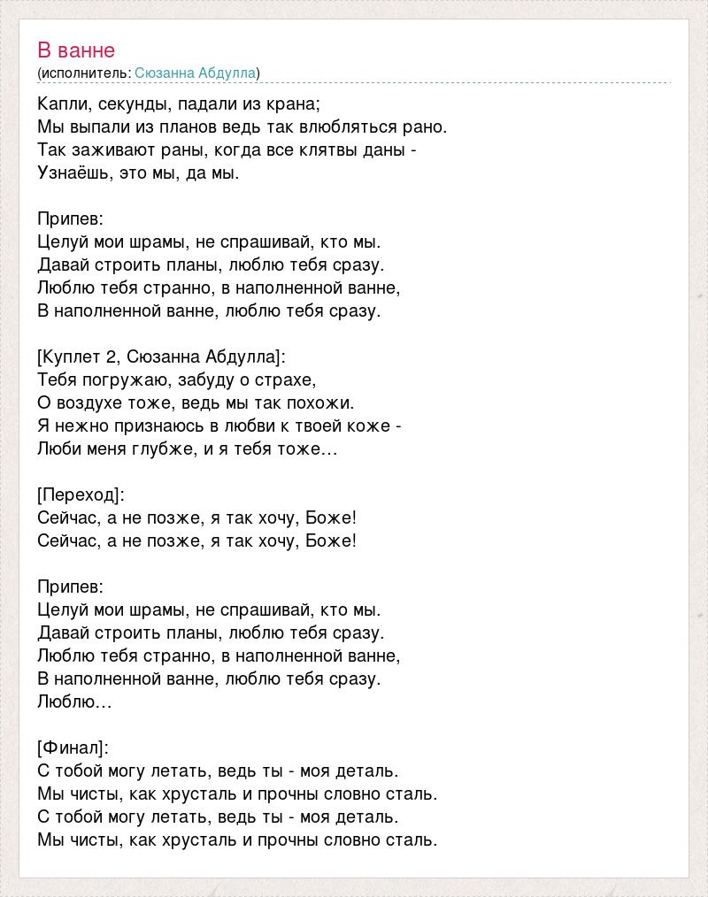 Капли, секунды, падали из крана; Мы выпали из планов ведь так влюбляться рано. Так заживают раны, когда все клятвы даны - Узнаёшь, это мы, да мы. Припев: Целуй мои шрамы, не спрашивай, кто мы. Давай строить планы, люблю тебя сразу. Люблю тебя странно, в наполненной ванне, В наполненной ванне, люблю тебя сразу. [Куплет 2, Сюзанна Абдулла]: Тебя погружаю, забуду о страхе, О воздухе тоже, ведь мы так похожи. Я нежно признаюсь в любви к твоей коже - Люби меня глубже, и я тебя тоже… [Переход]: Сейчас, а не позже, я так хочу, Боже! Сейчас, а не позже, я так хочу, Боже! Припев: Целуй мои шрамы, не спрашивай, кто мы. Давай строить планы, люблю тебя сразу. Люблю тебя странно, в наполненной ванне, В наполненной ванне, люблю тебя сразу. Люблю… [Финал]: С тобой могу летать, ведь ты - моя деталь. Мы чисты, как хрусталь и прочны словно сталь. С тобой могу летать, ведь ты - моя деталь. Мы чисты, как хрусталь и прочны словно сталь.