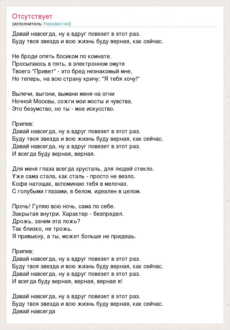 Давай навсегда, ну а вдруг повезет в этот раз. Буду твоя звезда и всю жизнь буду верная, как сейчас. Не броди опять босиком по комнате. Просыпаюсь в пять, в электронном омуте Твоего "Привет" - это бред незнакомый мне, Но теперь, на всю страну кричу: "Я тебя хочу!" Вылечи, выгони, вымани меня на огни Ночной Москвы, сожги мои мосты и чувства. Это безумство, но ты - мое искусство. Припев: Давай навсегда, ну а вдруг повезет в этот раз. Буду твоя звезда и всю жизнь буду верная, как сейчас. Давай навсегда, ну а вдруг повезет в этот раз. И всегда буду верная, верная. Для меня глаза всегда хрусталь, для людей стекло. Уже сама стала, как сталь - просто не везло. Кофе натощак, вспоминаю тебя в мелочах. С голубыми глазами, в белом, идеален в целом. Прочь! Гуляю всю ночь, сама по себе. Закрытая внутри. Характер - безпредел. Дрожь, зачем эта ложь? Так близко, не трожь. Я привыкну, а ты, может больше не придешь. Припев: Давай навсегда, ну а вдруг повезет в этот раз. Буду твоя звезда и всю жизнь буду верная, как сейчас. Давай навсегда, ну а вдруг повезет в этот раз. И всегда буду верная, верная, верная я! Давай навсегда, ну а вдруг повезет в этот раз. Буду твоя звезда и всю жизнь буду верная, как сейчас. Давай навсегда