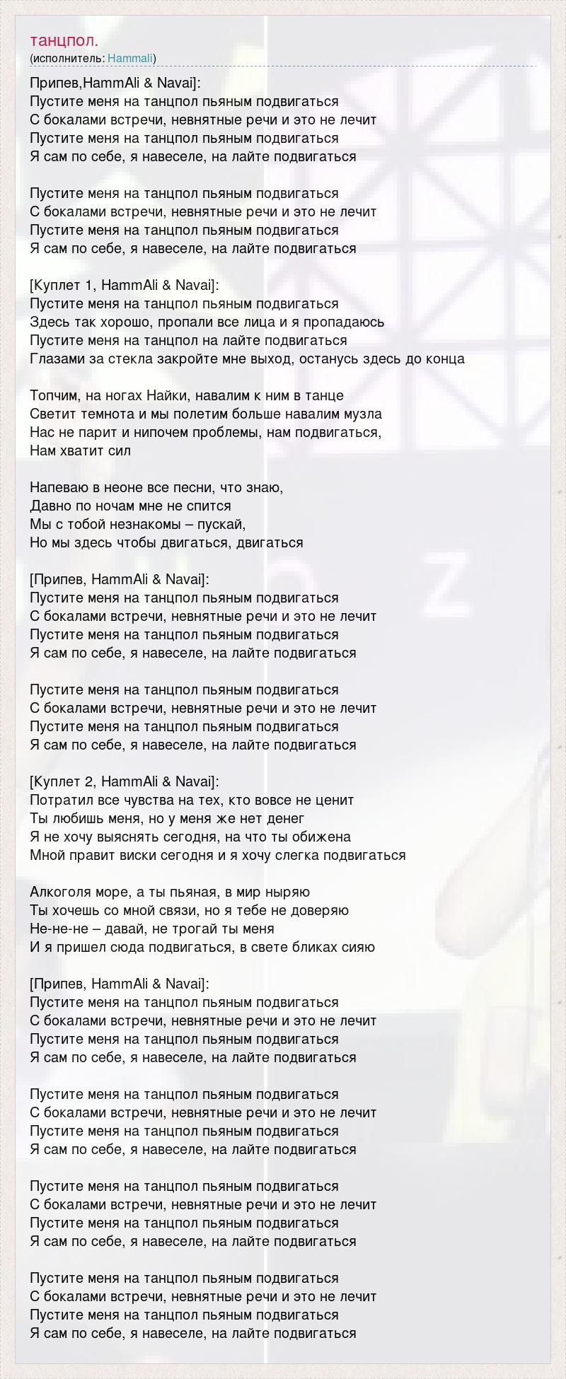 Припев,HammAli & Navai]: Пустите меня на танцпол пьяным подвигаться С бокалами встречи, невнятные речи и это не лечит Пустите меня на танцпол пьяным подвигаться Я сам по себе, я навеселе, на лайте подвигаться Пустите меня на танцпол пьяным подвигаться С бокалами встречи, невнятные речи и это не лечит Пустите меня на танцпол пьяным подвигаться Я сам по себе, я навеселе, на лайте подвигаться [Куплет 1, HammAli & Navai]: Пустите меня на танцпол пьяным подвигаться Здесь так хорошо, пропали все лица и я пропадаюсь Пустите меня на танцпол на лайте подвигаться Глазами за стекла закройте мне выход, останусь здесь до конца Топчим, на ногах Найки, навалим к ним в танце Светит темнота и мы полетим больше навалим музла Нас не парит и нипочем проблемы, нам подвигаться, Нам хватит сил Напеваю в неоне все песни, что знаю, Давно по ночам мне не спится Мы с тобой незнакомы – пускай, Но мы здесь чтобы двигаться, двигаться [Припев, HammAli & Navai]: Пустите меня на танцпол пьяным подвигаться С бокалами встречи, невнятные речи и это не лечит Пустите меня на танцпол пьяным подвигаться Я сам по себе, я навеселе, на лайте подвигаться Пустите меня на танцпол пьяным подвигаться С бокалами встречи, невнятные речи и это не лечит Пустите меня на танцпол пьяным подвигаться Я сам по себе, я навеселе, на лайте подвигаться [Куплет 2, HammAli & Navai]: Потратил все чувства на тех, кто вовсе не ценит Ты любишь меня, но у меня же нет денег Я не хочу выяснять сегодня, на что ты обижена Мной правит виски сегодня и я хочу слегка подвигаться Алкоголя море, а ты пьяная, в мир ныряю Ты хочешь со мной связи, но я тебе не доверяю Не-не-не – давай, не трогай ты меня И я пришел сюда подвигаться, в свете бликах сияю [Припев, HammAli & Navai]: Пустите меня на танцпол пьяным подвигаться С бокалами встречи, невнятные речи и это не лечит Пустите меня на танцпол пьяным подвигаться Я сам по себе, я навеселе, на лайте подвигаться Пустите меня на танцпол пьяным подвигаться С бокалами встречи, невнятные речи и это не лечит Пустите меня на танцпол пьяным подвигаться Я сам по себе, я навеселе, на лайте подвигаться Пустите меня на танцпол пьяным подвигаться С бокалами встречи, невнятные речи и это не лечит Пустите меня на танцпол пьяным подвигаться Я сам по себе, я навеселе, на лайте подвигаться Пустите меня на танцпол пьяным подвигаться С бокалами встречи, невнятные речи и это не лечит Пустите меня на танцпол пьяным подвигаться Я сам по себе, я навеселе, на лайте подвигаться
