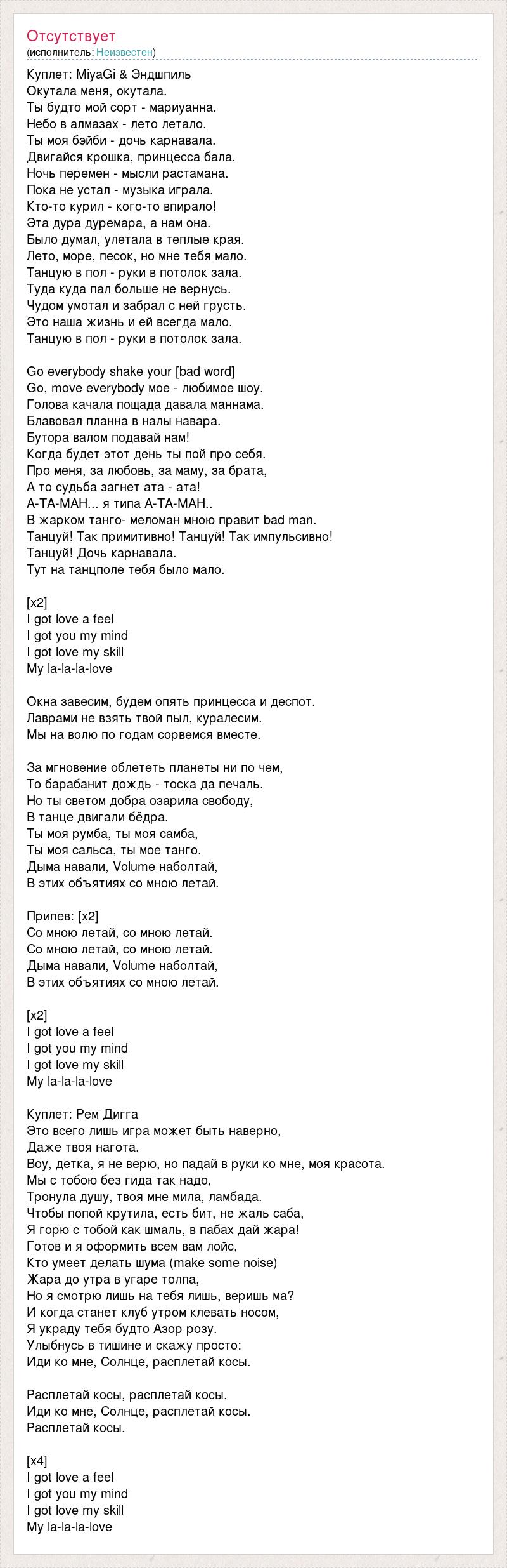Куплет: MiyaGi & Эндшпиль Окутала меня, окутала. Ты будто мой сорт - мариуанна. Небо в алмазах - лето летало. Ты моя бэйби - дочь карнавала. Двигайся крошка, принцесса бала. Ночь перемен - мысли растамана. Пока не устал - музыка играла. Кто-то курил - кого-то впирало! Эта дура дуремара, а нам она. Было думал, улетала в теплые края. Лето, море, песок, но мне тебя мало. Танцую в пол - руки в потолок зала. Туда куда пал больше не вернусь. Чудом умотал и забрал с ней грусть. Это наша жизнь и ей всегда мало. Танцую в пол - руки в потолок зала. Go everybody shake your [bad word] Go, move everybody мое - любимое шоу. Голова качала пощада давала маннама. Блавовал планна в налы навара. Бутора валом подавай нам! Когда будет этот день ты пой про себя. Про меня, за любовь, за маму, за брата, А то судьба загнет ата - ата! А-ТА-МАН... я типа А-ТА-МАН.. В жарком танго- меломан мною правит bad man. Танцуй! Так примитивно! Танцуй! Так импульсивно! Танцуй! Дочь карнавала. Тут на танцполе тебя было мало. [x2] I got love a feel I got you my mind I got love my skill My la-la-la-love Окна завесим, будем опять принцесса и деспот. Лаврами не взять твой пыл, куралесим. Мы на волю по годам сорвемся вместе. За мгновение облететь планеты ни по чем, То барабанит дождь - тоска да печаль. Но ты светом добра озарила свободу, В танце двигали бёдра. Ты моя румба, ты моя самба, Ты моя сальса, ты мое танго. Дыма навали, Volume наболтай, В этих объятиях со мною летай. Припев: [х2] Со мною летай, со мною летай. Со мною летай, со мною летай. Дыма навали, Volume наболтай, В этих объятиях со мною летай. [х2] I got love a feel I got you my mind I got love my skill My la-la-la-love Куплет: Рем Дигга Это всего лишь игра может быть наверно, Даже твоя нагота. Воу, детка, я не верю, но падай в руки ко мне, моя красота. Мы с тобою без гида так надо, Тронула душу, твоя мне мила, ламбада. Чтобы попой крутила, есть бит, не жаль саба, Я горю с тобой как шмаль, в пабах дай жара! Готов и я оформить всем вам лойс, Кто умеет делать шума (make some noise) Жара до утра в угаре толпа, Но я смотрю лишь на тебя лишь, веришь ма? И когда станет клуб утром клевать носом, Я украду тебя будто Азор розу. Улыбнусь в тишине и скажу просто: Иди ко мне, Солнце, расплетай косы. Расплетай косы, расплетай косы. Иди ко мне, Солнце, расплетай косы. Расплетай косы. [x4] I got love a feel I got you my mind I got love my skill My la-la-la-love