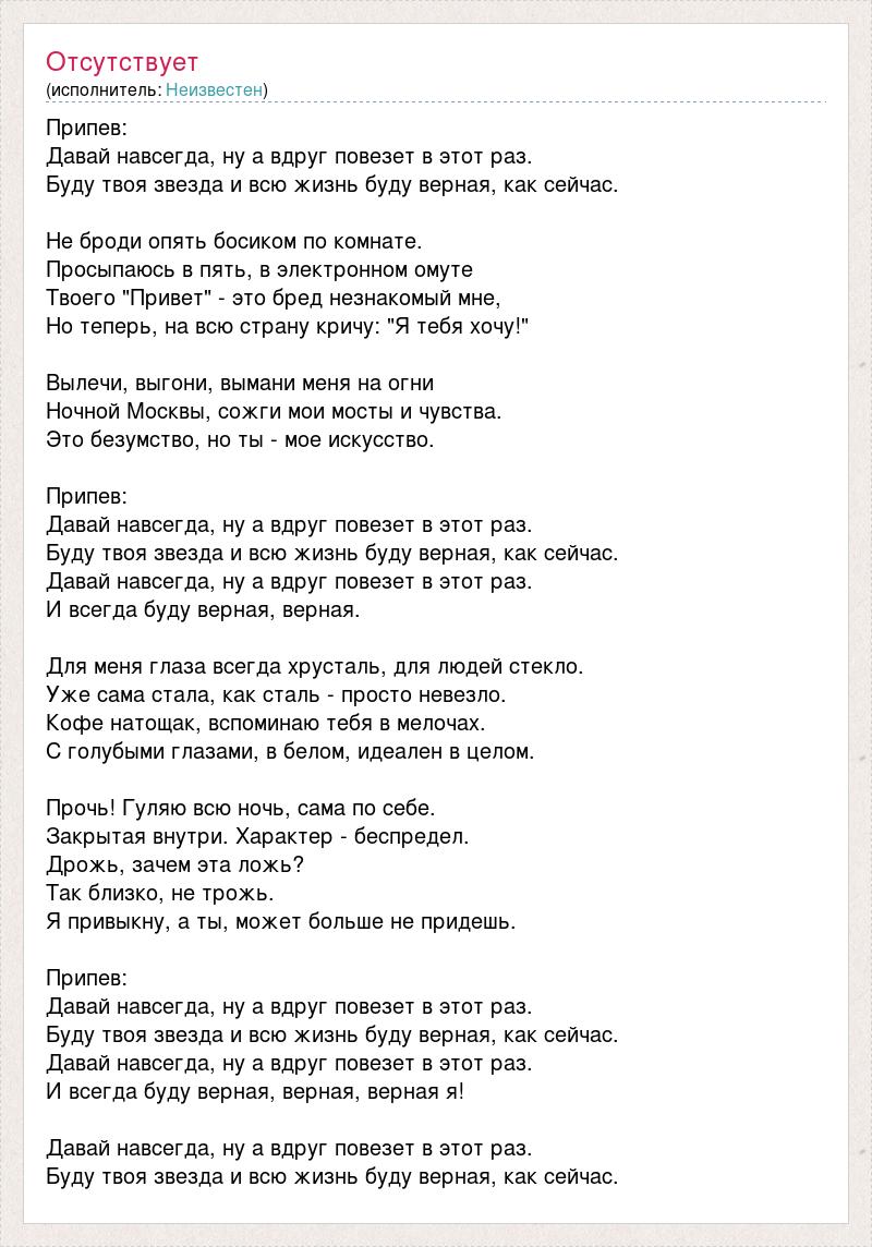 Припев: Давай навсегда, ну а вдруг повезет в этот раз. Буду твоя звезда и всю жизнь буду верная, как сейчас. Не броди опять босиком по комнате. Просыпаюсь в пять, в электронном омуте Твоего "Привет" - это бред незнакомый мне, Но теперь, на всю страну кричу: "Я тебя хочу!" Вылечи, выгони, вымани меня на огни Ночной Москвы, сожги мои мосты и чувства. Это безумство, но ты - мое искусство. Припев: Давай навсегда, ну а вдруг повезет в этот раз. Буду твоя звезда и всю жизнь буду верная, как сейчас. Давай навсегда, ну а вдруг повезет в этот раз. И всегда буду верная, верная. Для меня глаза всегда хрусталь, для людей стекло. Уже сама стала, как сталь - просто невезло. Кофе натощак, вспоминаю тебя в мелочах. С голубыми глазами, в белом, идеален в целом. Прочь! Гуляю всю ночь, сама по себе. Закрытая внутри. Характер - беспредел. Дрожь, зачем эта ложь? Так близко, не трожь. Я привыкну, а ты, может больше не придешь. Припев: Давай навсегда, ну а вдруг повезет в этот раз. Буду твоя звезда и всю жизнь буду верная, как сейчас. Давай навсегда, ну а вдруг повезет в этот раз. И всегда буду верная, верная, верная я! Давай навсегда, ну а вдруг повезет в этот раз. Буду твоя звезда и всю жизнь буду верная, как сейчас.