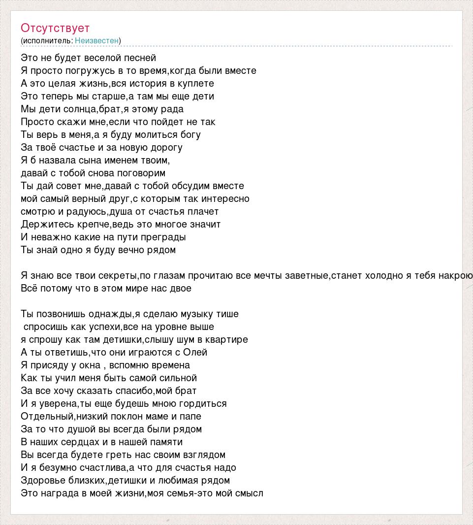 Это не будет веселой песней Я просто погружусь в то время,когда были вместе А это целая жизнь,вся история в куплете Это теперь мы старше,а там мы еще дети Мы дети солнца,брат,я этому рада Просто скажи мне,если что пойдет не так Ты верь в меня,а я буду молиться богу За твоё счастье и за новую дорогу Я б назвала сына именем твоим, давай с тобой снова поговорим Ты дай совет мне,давай с тобой обсудим вместе мой самый верный друг,с которым так интересно смотрю и радуюсь,душа от счастья плачет Держитесь крепче,ведь это многое значит И неважно какие на пути преграды Ты знай одно я буду вечно рядом Я знаю все твои секреты,по глазам прочитаю все мечты заветные,станет холодно я тебя накрою Всё потому что в этом мире нас двое Ты позвонишь однажды,я сделаю музыку тише спросишь как успехи,все на уровне выше я спрошу как там детишки,слышу шум в квартире А ты ответишь,что они играются с Олей Я присяду у окна , вспомню времена Как ты учил меня быть самой сильной За все хочу сказать спасибо,мой брат И я уверена,ты еще будешь мною гордиться Отдельный,низкий поклон маме и папе За то что душой вы всегда были рядом В наших сердцах и в нашей памяти Вы всегда будете греть нас своим взглядом И я безумно счастлива,а что для счастья надо Здоровье близких,детишки и любимая рядом Это награда в моей жизни,моя семья-это мой смысл