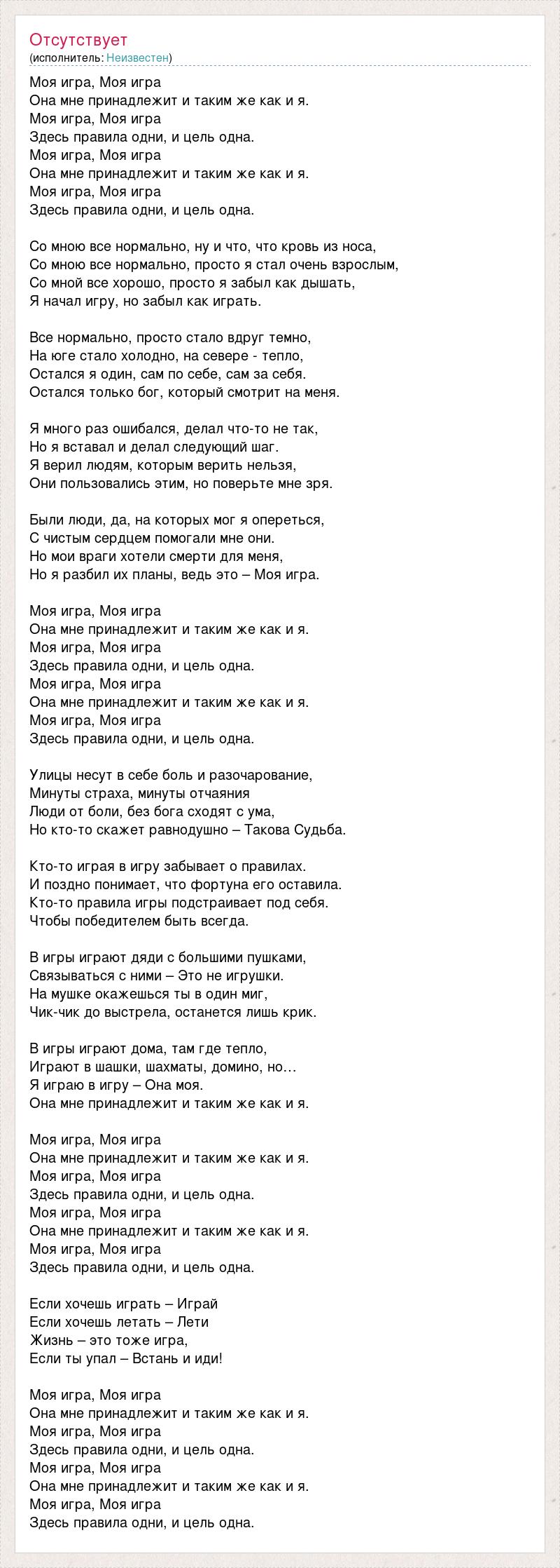 Моя игра, Моя игра Она мне принадлежит и таким же как и я. Моя игра, Моя игра Здесь правила одни, и цель одна. Моя игра, Моя игра Она мне принадлежит и таким же как и я. Моя игра, Моя игра Здесь правила одни, и цель одна. Со мною все нормально, ну и что, что кровь из носа, Со мною все нормально, просто я стал очень взрослым, Со мной все хорошо, просто я забыл как дышать, Я начал игру, но забыл как играть. Все нормально, просто стало вдруг темно, На юге стало холодно, на севере - тепло, Остался я один, сам по себе, сам за себя. Остался только бог, который смотрит на меня. Я много раз ошибался, делал что-то не так, Но я вставал и делал следующий шаг. Я верил людям, которым верить нельзя, Они пользовались этим, но поверьте мне зря. Были люди, да, на которых мог я опереться, С чистым сердцем помогали мне они. Но мои враги хотели смерти для меня, Но я разбил их планы, ведь это – Моя игра. Моя игра, Моя игра Она мне принадлежит и таким же как и я. Моя игра, Моя игра Здесь правила одни, и цель одна. Моя игра, Моя игра Она мне принадлежит и таким же как и я. Моя игра, Моя игра Здесь правила одни, и цель одна. Улицы несут в себе боль и разочарование, Минуты страха, минуты отчаяния Люди от боли, без бога сходят с ума, Но кто-то скажет равнодушно – Такова Судьба. Кто-то играя в игру забывает о правилах. И поздно понимает, что фортуна его оставила. Кто-то правила игры подстраивает под себя. Чтобы победителем быть всегда. В игры играют дяди с большими пушками, Связываться с ними – Это не игрушки. На мушке окажешься ты в один миг, Чик-чик до выстрела, останется лишь крик. В игры играют дома, там где тепло, Играют в шашки, шахматы, домино, но… Я играю в игру – Она моя. Она мне принадлежит и таким же как и я. Моя игра, Моя игра Она мне принадлежит и таким же как и я. Моя игра, Моя игра Здесь правила одни, и цель одна. Моя игра, Моя игра Она мне принадлежит и таким же как и я. Моя игра, Моя игра Здесь правила одни, и цель одна. Если хочешь играть – Играй Если хочешь летать – Лети Жизнь – это тоже игра, Если ты упал – Встань и иди! Моя игра, Моя игра Она мне принадлежит и таким же как и я. Моя игра, Моя игра Здесь правила одни, и цель одна. Моя игра, Моя игра Она мне принадлежит и таким же как и я. Моя игра, Моя игра Здесь правила одни, и цель одна.
