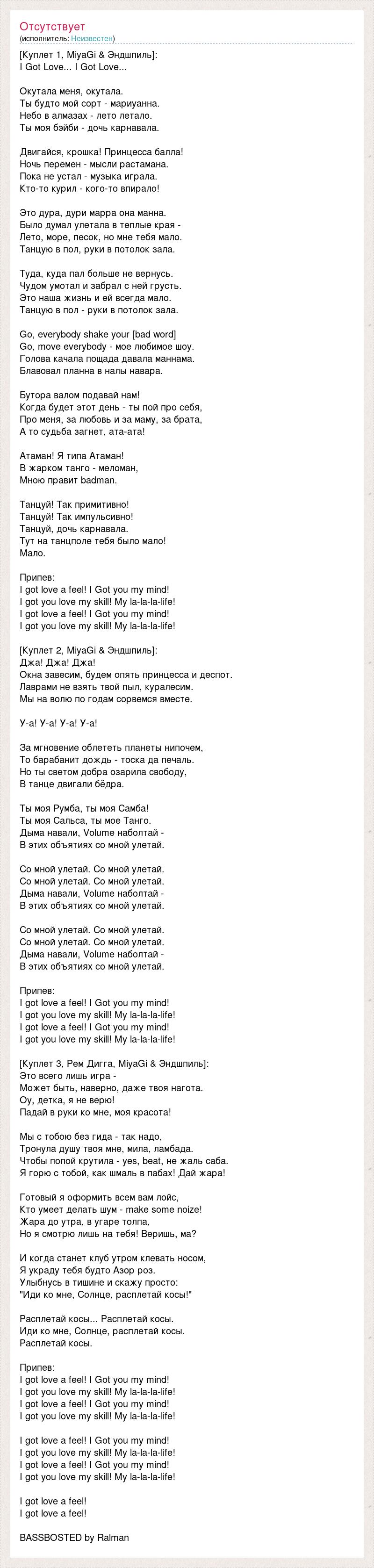 [Куплет 1, MiyaGi & Эндшпиль]: I Got Love... I Got Love... Окутала меня, окутала. Ты будто мой сорт - мариуанна. Небо в алмазах - лето летало. Ты моя бэйби - дочь карнавала. Двигайся, крошка! Принцесса балла! Ночь перемен - мысли растамана. Пока не устал - музыка играла. Кто-то курил - кого-то впирало! Это дура, дури марра она манна. Было думал улетала в теплые края - Лето, море, песок, но мне тебя мало. Танцую в пол, руки в потолок зала. Туда, куда пал больше не вернусь. Чудом умотал и забрал с ней грусть. Это наша жизнь и ей всегда мало. Танцую в пол - руки в потолок зала. Go, everybody shake your [bad word] Go, move everybody - мое любимое шоу. Голова качала пощада давала маннама. Блавовал планна в налы навара. Бутора валом подавай нам! Когда будет этот день - ты пой про себя, Про меня, за любовь и за маму, за брата, А то судьба загнет, ата-ата! Атаман! Я типа Атаман! В жарком танго - меломан, Мною правит badman. Танцуй! Так примитивно! Танцуй! Так импульсивно! Танцуй, дочь карнавала. Тут на танцполе тебя было мало! Мало. Припев: I got love a feel! I Got you my mind! I got you love my skill! My la-la-la-life! I got love a feel! I Got you my mind! I got you love my skill! My la-la-la-life! [Куплет 2, MiyaGi & Эндшпиль]: Джа! Джа! Джа! Окна завесим, будем опять принцесса и деспот. Лаврами не взять твой пыл, куралесим. Мы на волю по годам сорвемся вместе. У-а! У-а! У-а! У-а! За мгновение облететь планеты нипочем, То барабанит дождь - тоска да печаль. Но ты светом добра озарила свободу, В танце двигали бёдра. Ты моя Румба, ты моя Самба! Ты моя Сальса, ты мое Танго. Дыма навали, Volume наболтай - В этих объятиях со мной улетай. Со мной улетай. Со мной улетай. Со мной улетай. Со мной улетай. Дыма навали, Volume наболтай - В этих объятиях со мной улетай. Со мной улетай. Со мной улетай. Со мной улетай. Со мной улетай. Дыма навали, Volume наболтай - В этих объятиях со мной улетай. Припев: I got love a feel! I Got you my mind! I got you love my skill! My la-la-la-life! I got love a feel! I Got you my mind! I got you love my skill! My la-la-la-life! [Куплет 3, Рем Дигга, MiyaGi & Эндшпиль]: Это всего лишь игра - Может быть, наверно, даже твоя нагота. Оу, детка, я не верю! Падай в руки ко мне, моя красота! Мы с тобою без гида - так надо, Тронула душу твоя мне, мила, ламбада. Чтобы попой крутила - yes, beat, не жаль саба. Я горю с тобой, как шмаль в пабах! Дай жара! Готовый я оформить всем вам лойс, Кто умеет делать шум - make some noize! Жара до утра, в угаре толпа, Но я смотрю лишь на тебя! Веришь, ма? И когда станет клуб утром клевать носом, Я украду тебя будто Азор роз. Улыбнусь в тишине и скажу просто: "Иди ко мне, Солнце, расплетай косы!" Расплетай косы... Расплетай косы. Иди ко мне, Солнце, расплетай косы. Расплетай косы. Припев: I got love a feel! I Got you my mind! I got you love my skill! My la-la-la-life! I got love a feel! I Got you my mind! I got you love my skill! My la-la-la-life! I got love a feel! I Got you my mind! I got you love my skill! My la-la-la-life! I got love a feel! I Got you my mind! I got you love my skill! My la-la-la-life! I got love a feel! I got love a feel! BASSBOSTED by Ralman