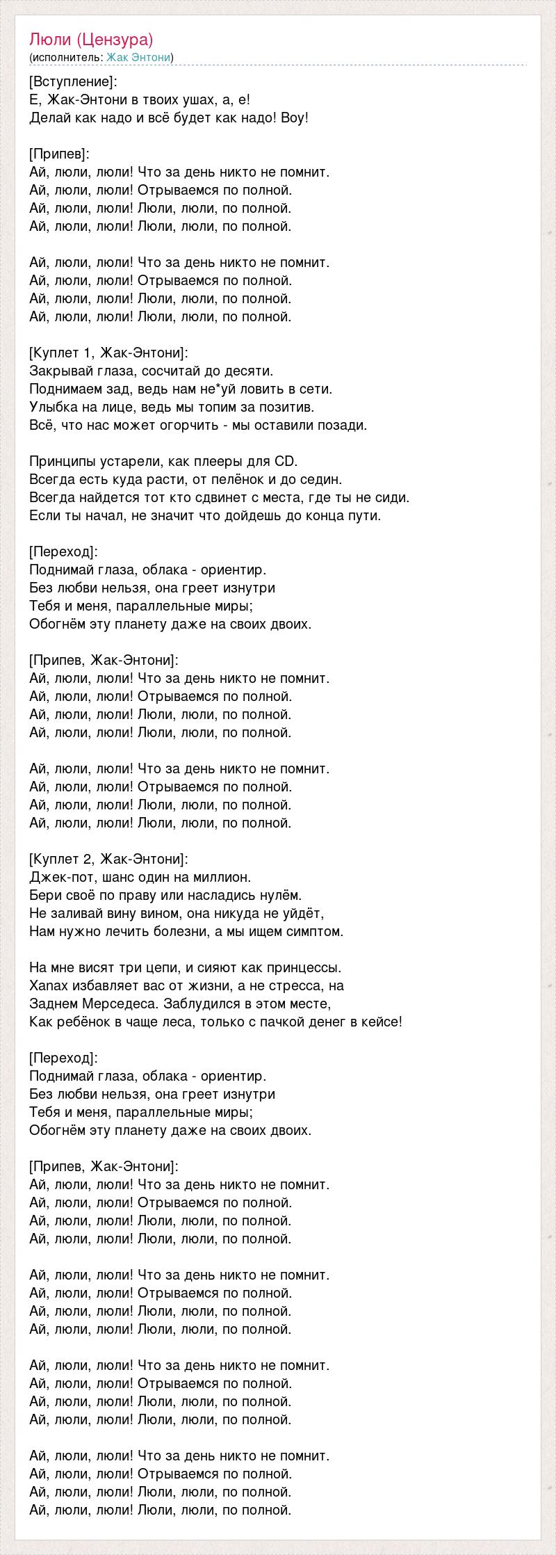 [Вступление]: Е, Жак-Энтони в твоих ушах, а, е! Делай как надо и всё будет как надо! Воу! [Припев]: Ай, люли, люли! Что за день никто не помнит. Ай, люли, люли! Отрываемся по полной. Ай, люли, люли! Люли, люли, по полной. Ай, люли, люли! Люли, люли, по полной. Ай, люли, люли! Что за день никто не помнит. Ай, люли, люли! Отрываемся по полной. Ай, люли, люли! Люли, люли, по полной. Ай, люли, люли! Люли, люли, по полной. [Куплет 1, Жак-Энтони]: Закрывай глаза, сосчитай до десяти. Поднимаем зад, ведь нам не*уй ловить в сети. Улыбка на лице, ведь мы топим за позитив. Всё, что нас может огорчить - мы оставили позади. Принципы устарели, как плееры для CD. Всегда есть куда расти, от пелёнок и до седин. Всегда найдется тот кто сдвинет с места, где ты не сиди. Если ты начал, не значит что дойдешь до конца пути. [Переход]: Поднимай глаза, облака - ориентир. Без любви нельзя, она греет изнутри Тебя и меня, параллельные миры; Обогнём эту планету даже на своих двоих. [Припев, Жак-Энтони]: Ай, люли, люли! Что за день никто не помнит. Ай, люли, люли! Отрываемся по полной. Ай, люли, люли! Люли, люли, по полной. Ай, люли, люли! Люли, люли, по полной. Ай, люли, люли! Что за день никто не помнит. Ай, люли, люли! Отрываемся по полной. Ай, люли, люли! Люли, люли, по полной. Ай, люли, люли! Люли, люли, по полной. [Куплет 2, Жак-Энтони]: Джек-пот, шанс один на миллион. Бери своё по праву или насладись нулём. Не заливай вину вином, она никуда не уйдёт, Нам нужно лечить болезни, а мы ищем симптом. На мне висят три цепи, и сияют как принцессы. Xanax избавляет вас от жизни, а не стресса, на Заднем Мерседеса. Заблудился в этом месте, Как ребёнок в чаще леса, только с пачкой денег в кейсе! [Переход]: Поднимай глаза, облака - ориентир. Без любви нельзя, она греет изнутри Тебя и меня, параллельные миры; Обогнём эту планету даже на своих двоих. [Припев, Жак-Энтони]: Ай, люли, люли! Что за день никто не помнит. Ай, люли, люли! Отрываемся по полной. Ай, люли, люли! Люли, люли, по полной. Ай, люли, люли! Люли, люли, по полной. Ай, люли, люли! Что за день никто не помнит. Ай, люли, люли! Отрываемся по полной. Ай, люли, люли! Люли, люли, по полной. Ай, люли, люли! Люли, люли, по полной. Ай, люли, люли! Что за день никто не помнит. Ай, люли, люли! Отрываемся по полной. Ай, люли, люли! Люли, люли, по полной. Ай, люли, люли! Люли, люли, по полной. Ай, люли, люли! Что за день никто не помнит. Ай, люли, люли! Отрываемся по полной. Ай, люли, люли! Люли, люли, по полной. Ай, люли, люли! Люли, люли, по полной.