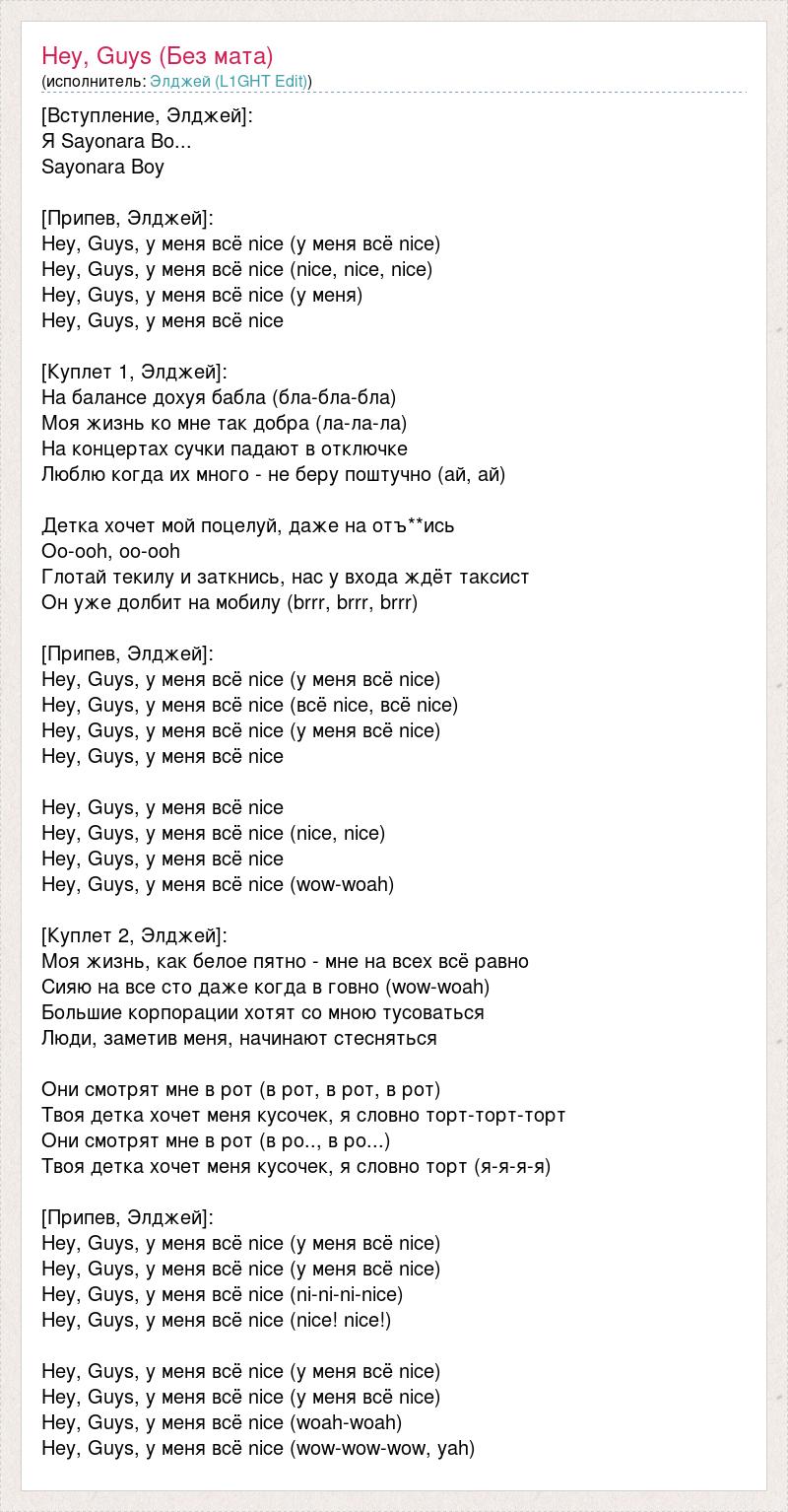 [Вступление, Элджей]: Я Sayonara Bo... Sayonara Boy [Припев, Элджей]: Hey, Guys, у меня всё nice (у меня всё nice) Hey, Guys, у меня всё nice (nice, nice, nice) Hey, Guys, у меня всё nice (у меня) Hey, Guys, у меня всё nice [Куплет 1, Элджей]: На балансе дохуя бабла (бла-бла-бла) Моя жизнь ко мне так добра (ла-ла-ла) На концертах сучки падают в отключке Люблю когда их много - не беру поштучно (ай, ай) Детка хочет мой поцелуй, даже на отъ**ись Oo-ooh, oo-ooh Глотай текилу и заткнись, нас у входа ждёт таксист Он уже долбит на мобилу (brrr, brrr, brrr) [Припев, Элджей]: Hey, Guys, у меня всё nice (у меня всё nice) Hey, Guys, у меня всё nice (всё nice, всё nice) Hey, Guys, у меня всё nice (у меня всё nice) Hey, Guys, у меня всё nice Hey, Guys, у меня всё nice Hey, Guys, у меня всё nice (nice, nice) Hey, Guys, у меня всё nice Hey, Guys, у меня всё nice (wow-woah) [Куплет 2, Элджей]: Моя жизнь, как белое пятно - мне на всех всё равно Сияю на все сто даже когда в говно (wow-woah) Большие корпорации хотят со мною тусоваться Люди, заметив меня, начинают стесняться Они смотрят мне в рот (в рот, в рот, в рот) Твоя детка хочет меня кусочек, я словно торт-торт-торт Они смотрят мне в рот (в ро.., в ро...) Твоя детка хочет меня кусочек, я словно торт (я-я-я-я) [Припев, Элджей]: Hey, Guys, у меня всё nice (у меня всё nice) Hey, Guys, у меня всё nice (у меня всё nice) Hey, Guys, у меня всё nice (ni-ni-ni-nice) Hey, Guys, у меня всё nice (nice! nice!) Hey, Guys, у меня всё nice (у меня всё nice) Hey, Guys, у меня всё nice (у меня всё nice) Hey, Guys, у меня всё nice (woah-woah) Hey, Guys, у меня всё nice (wow-wow-wow, yah)