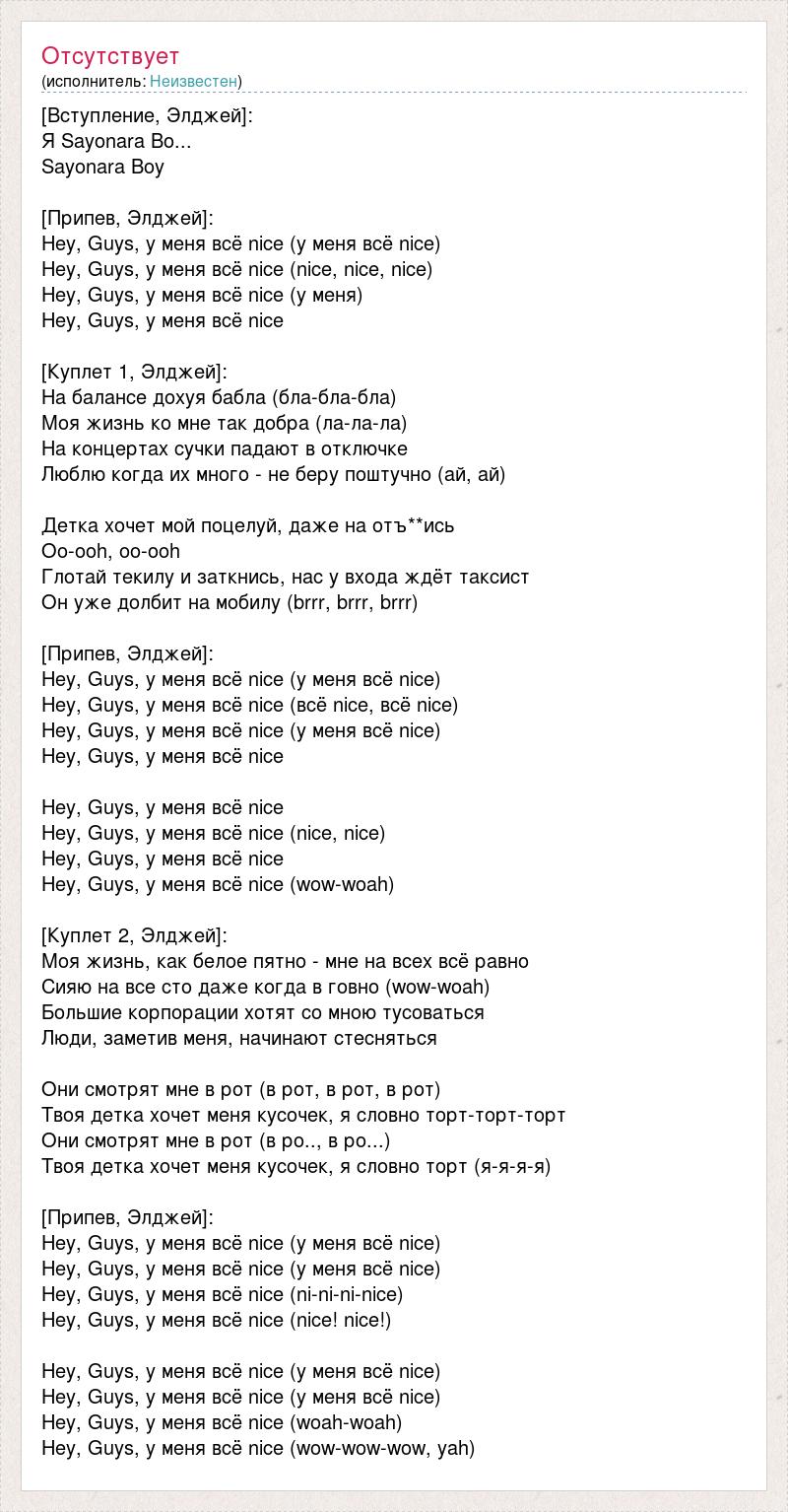 [Вступление, Элджей]: Я Sayonara Bo... Sayonara Boy [Припев, Элджей]: Hey, Guys, у меня всё nice (у меня всё nice) Hey, Guys, у меня всё nice (nice, nice, nice) Hey, Guys, у меня всё nice (у меня) Hey, Guys, у меня всё nice [Куплет 1, Элджей]: На балансе дохуя бабла (бла-бла-бла) Моя жизнь ко мне так добра (ла-ла-ла) На концертах сучки падают в отключке Люблю когда их много - не беру поштучно (ай, ай) Детка хочет мой поцелуй, даже на отъ**ись Oo-ooh, oo-ooh Глотай текилу и заткнись, нас у входа ждёт таксист Он уже долбит на мобилу (brrr, brrr, brrr) [Припев, Элджей]: Hey, Guys, у меня всё nice (у меня всё nice) Hey, Guys, у меня всё nice (всё nice, всё nice) Hey, Guys, у меня всё nice (у меня всё nice) Hey, Guys, у меня всё nice Hey, Guys, у меня всё nice Hey, Guys, у меня всё nice (nice, nice) Hey, Guys, у меня всё nice Hey, Guys, у меня всё nice (wow-woah) [Куплет 2, Элджей]: Моя жизнь, как белое пятно - мне на всех всё равно Сияю на все сто даже когда в говно (wow-woah) Большие корпорации хотят со мною тусоваться Люди, заметив меня, начинают стесняться Они смотрят мне в рот (в рот, в рот, в рот) Твоя детка хочет меня кусочек, я словно торт-торт-торт Они смотрят мне в рот (в ро.., в ро...) Твоя детка хочет меня кусочек, я словно торт (я-я-я-я) [Припев, Элджей]: Hey, Guys, у меня всё nice (у меня всё nice) Hey, Guys, у меня всё nice (у меня всё nice) Hey, Guys, у меня всё nice (ni-ni-ni-nice) Hey, Guys, у меня всё nice (nice! nice!) Hey, Guys, у меня всё nice (у меня всё nice) Hey, Guys, у меня всё nice (у меня всё nice) Hey, Guys, у меня всё nice (woah-woah) Hey, Guys, у меня всё nice (wow-wow-wow, yah)