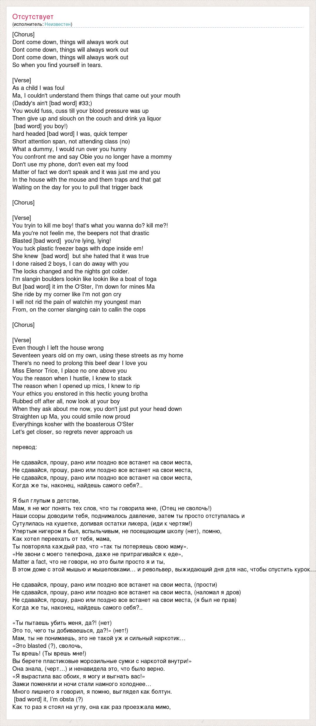 [Chorus] Dont come down, things will always work out Dont come down, things will always work out Dont come down, things will always work out So when you find yourself in tears. [Verse] As a child I was foul Ma, I couldn't understand them things that came out your mouth (Daddy's ain't [bad word] #33;) You would fuss, cuss till your blood pressure was up Then give up and slouch on the couch and drink ya liquor [bad word] you boy!) hard headed [bad word] I was, quick temper Short attention span, not attending class (no) What a dummy, I would run over you hunny You confront me and say Obie you no longer have a mommy Don't use my phone, don't even eat my food Matter of fact we don't speak and it was just me and you In the house with the mouse and them traps and that gat Waiting on the day for you to pull that trigger back [Chorus] [Verse] You tryin to kill me boy! that's what you wanna do? kill me?! Ma you're not feelin me, the beepers not that drastic Blasted [bad word] you're lying, lying! You tuck plastic freezer bags with dope inside em! She knew [bad word] but she hated that it was true I done raised 2 boys, I can do away with you The locks changed and the nights got colder. I'm slangin boulders lookin like lookin like a boat of toga But [bad word] it im the O'Ster, I'm down for mines Ma She ride by my corner like I'm not gon cry I will not rid the pain of watchin my youngest man From, on the corner slanging cain to callin the cops [Chorus] [Verse] Even though I left the house wrong Seventeen years old on my own, using these streets as my home There's no need to prolong this beef dear I love you Miss Elenor Trice, I place no one above you You the reason when I hustle, I knew to stack The reason when I opened up mics, I knew to rip Your ethics you enstored in this hectic young brotha Rubbed off after all, now look at your boy When they ask about me now, you don't just put your head down Straighten up Ma, you could smile now proud Everythings kosher with the boasterous O'Ster Let's get closer, so regrets never approach us перевод: Не сдавайся, прошу, рано или поздно все встанет на свои места, Не сдавайся, прошу, рано или поздно все встанет на свои места, Не сдавайся, прошу, рано или поздно все встанет на свои места, Когда же ты, наконец, найдешь самого себя?.. Я был глупым в детстве, Мам, я не мог понять тех слов, что ты говорила мне, (Отец не сволочь!) Наши ссоры доводили тебя, поднималось давление, затем ты просто отступалась и Сутулилась на кушетке, допивая остатки ликера, (иди к чертям!) Упертым нигером я был, вспыльчивым, не посещающим школу (нет), помню, Как хотел переехать от тебя, мама, Ты повторяла каждый раз, что «так ты потеряешь свою маму». «Не звони с моего телефона, даже не притрагивайся к еде», Matter a fact, что не говори, но это были просто я и ты, В этом доме с этой мышью и мышеловками… и револьвер, выжидающий дня для нас, чтобы спустить курок… Не сдавайся, прошу, рано или поздно все встанет на свои места, (прости) Не сдавайся, прошу, рано или поздно все встанет на свои места, (наломал я дров) Не сдавайся, прошу, рано или поздно все встанет на свои места, (я был не прав) Когда же ты, наконец, найдешь самого себя?.. «Ты пытаешь убить меня, да?! (нет) Это то, чего ты добиваешься, да?!» (нет!) Мам, ты не понимаешь, это не такой уж и сильный наркотик… «Это blasted (?), сволочь, Ты врешь! (Ты врешь мне!) Вы берете пластиковые морозильные сумки с наркотой внутри!» Она знала, (черт…) и ненавидела это, что было верно. «Я вырастила вас обоих, я могу и выгнать вас!» Замки поменяли и ночи стали намного холоднее… Много лишнего я говорил, я помню, выглядел как болтун. [bad word] it, I’m obsta (?) Как то раз я стоял на углу, она как раз проезжала мимо,