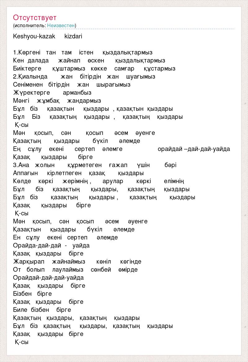 Keshyou-kazak kizdari 1.Көргені тан там істен қыздалықтармыз Кен далада жайнап өскен қыздалықтармыз Биіктерге құштармыз көкке самғар құстармыз 2.Қиалында жан бітірдін жан шуағымыз Сеніменен бітірдін жан шырағымыз Жүректерге арманбыз Мәнгі жұмбақ жандармыз Бұл біз қазақтын қыздары , қазақтын қыздары Бұл Біз қазақтың қыздары , қазақтың қыздары Қ-сы Мән қосып, сән қосып әсем әуенге Қазақтың қыздары бүкіл әлемде Ең сұлу екені сертеп әлемге орайдай –дай-дай-уайда Қазақ қыздары бірге 3.Ана жолын құрметеген ғажап үшін бәрі Аппағын кірлетпеген қазақ қыздары Көлде көркі жерімнің , арулар көркі елімнің Бұл біз қазақтың қыздары, қазақтың қыздары Бұл біз қазақтың қыздары , қазақтың қыздары Қазақ қыздары бірге Қ-сы Мән қосып, сән қосып әсем әуенге Қазақтын қыздары бүкіл әлемде Ен сұлу екені сертеп әлемде Орайда-дай-дай - уайда Қазақ қыздары бірге Жарқырап жайнаймыз көніл көгінде От болып лаулаймыз сөнбей өмірде Орайдай-дай-дай-уайда Қазақ қыздары бірге Бізбен бірге Қазақ қыздары бірге Биле бізбен бірге Қазақтың қыздары, қазақтың қыздары Бұл біз қазақтың қыздары, қазақтың қыздары Қазақ қыздары бірге Қ-сы