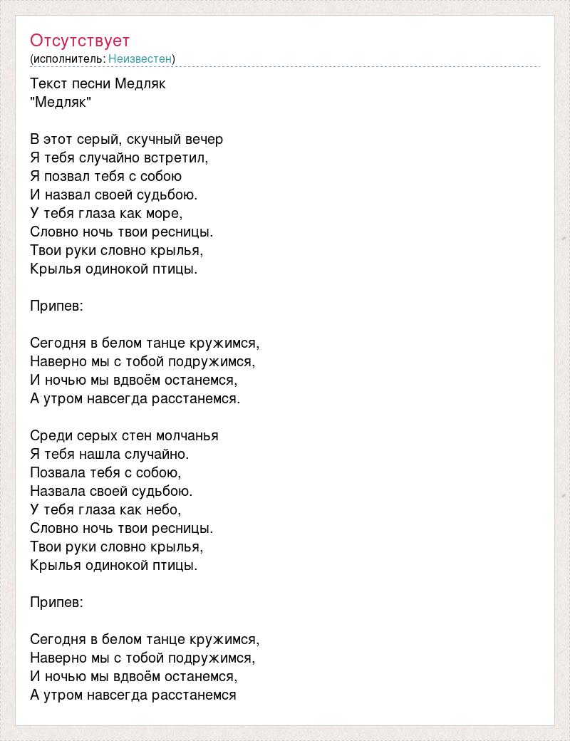 Текст песни Медляк "Медляк" В этот серый, скучный вечер Я тебя случайно встретил, Я позвал тебя с собою И назвал своей судьбою. У тебя глаза как море, Словно ночь твои ресницы. Твои руки словно крылья, Крылья одинокой птицы. Припев: Сегодня в белом танце кружимся, Наверно мы с тобой подружимся, И ночью мы вдвоём останемся, А утром навсегда расстанемся. Среди серых стен молчанья Я тебя нашла случайно. Позвала тебя с собою, Назвала своей судьбою. У тебя глаза как небо, Словно ночь твои ресницы. Твои руки словно крылья, Крылья одинокой птицы. Припев: Сегодня в белом танце кружимся, Наверно мы с тобой подружимся, И ночью мы вдвоём останемся, А утром навсегда расстанемся