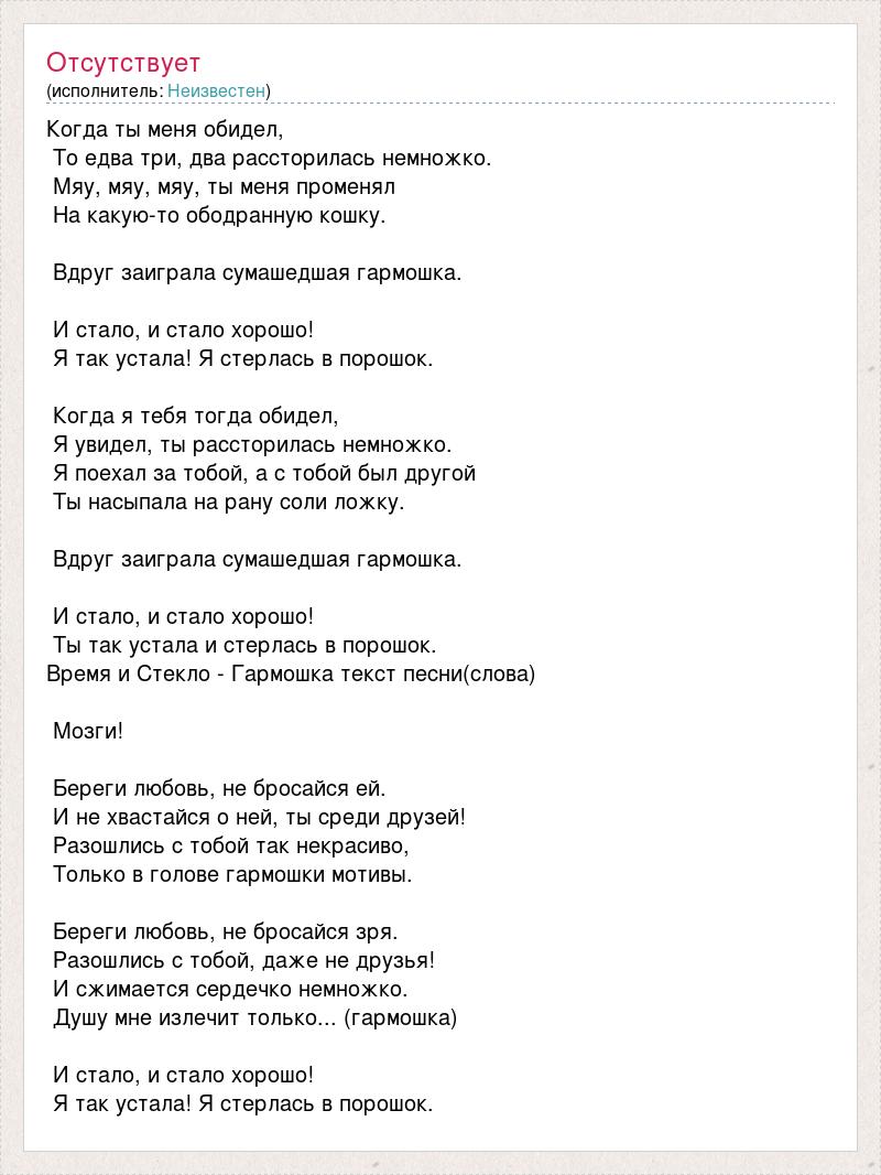 Когда ты меня обидел, То едва три, два рассторилась немножко. Мяу, мяу, мяу, ты меня променял На какую-то ободранную кошку. Вдруг заиграла сумашедшая гармошка. И стало, и стало хорошо! Я так устала! Я стерлась в порошок. Когда я тебя тогда обидел, Я увидел, ты рассторилась немножко. Я поехал за тобой, а с тобой был другой Ты насыпала на рану соли ложку. Вдруг заиграла сумашедшая гармошка. И стало, и стало хорошо! Ты так устала и стерлась в порошок. Время и Стекло - Гармошка текст песни(слова) Мозги! Береги любовь, не бросайся ей. И не хвастайся о ней, ты среди друзей! Разошлись с тобой так некрасиво, Только в голове гармошки мотивы. Береги любовь, не бросайся зря. Разошлись с тобой, даже не друзья! И сжимается сердечко немножко. Душу мне излечит только... (гармошка) И стало, и стало хорошо! Я так устала! Я стерлась в порошок.