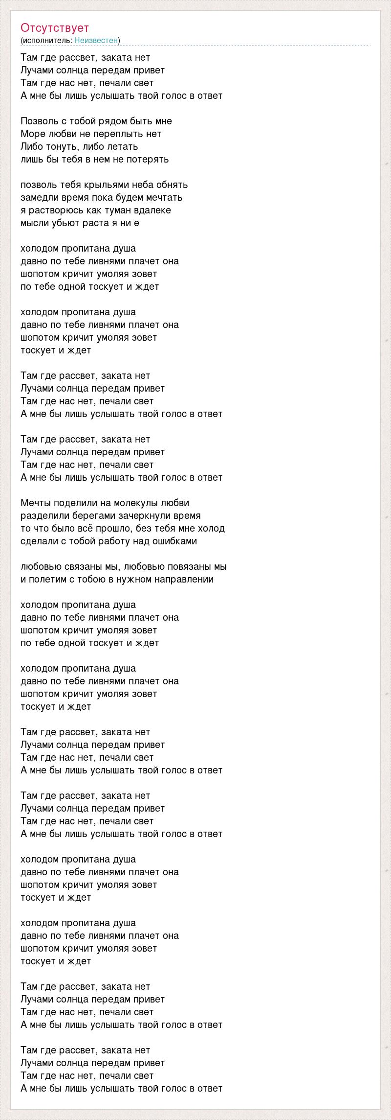 Там где рассвет, заката нет Лучами солнца передам привет Там где нас нет, печали свет А мне бы лишь услышать твой голос в ответ Позволь с тобой рядом быть мне Море любви не переплыть нет Либо тонуть, либо летать лишь бы тебя в нем не потерять позволь тебя крыльями неба обнять замедли время пока будем мечтать я растворюсь как туман вдалеке мысли убьют раста я ни е холодом пропитана душа давно по тебе ливнями плачет она шопотом кричит умоляя зовет по тебе одной тоскует и ждет холодом пропитана душа давно по тебе ливнями плачет она шопотом кричит умоляя зовет тоскует и ждет Там где рассвет, заката нет Лучами солнца передам привет Там где нас нет, печали свет А мне бы лишь услышать твой голос в ответ Там где рассвет, заката нет Лучами солнца передам привет Там где нас нет, печали свет А мне бы лишь услышать твой голос в ответ Мечты поделили на молекулы любви разделили берегами зачеркнули время то что было всё прошло, без тебя мне холод сделали с тобой работу над ошибками любовью связаны мы, любовью повязаны мы и полетим с тобою в нужном направлении холодом пропитана душа давно по тебе ливнями плачет она шопотом кричит умоляя зовет по тебе одной тоскует и ждет холодом пропитана душа давно по тебе ливнями плачет она шопотом кричит умоляя зовет тоскует и ждет Там где рассвет, заката нет Лучами солнца передам привет Там где нас нет, печали свет А мне бы лишь услышать твой голос в ответ Там где рассвет, заката нет Лучами солнца передам привет Там где нас нет, печали свет А мне бы лишь услышать твой голос в ответ холодом пропитана душа давно по тебе ливнями плачет она шопотом кричит умоляя зовет тоскует и ждет холодом пропитана душа давно по тебе ливнями плачет она шопотом кричит умоляя зовет тоскует и ждет Там где рассвет, заката нет Лучами солнца передам привет Там где нас нет, печали свет А мне бы лишь услышать твой голос в ответ Там где рассвет, заката нет Лучами солнца передам привет Там где нас нет, печали свет А мне бы лишь услышать твой голос в ответ
