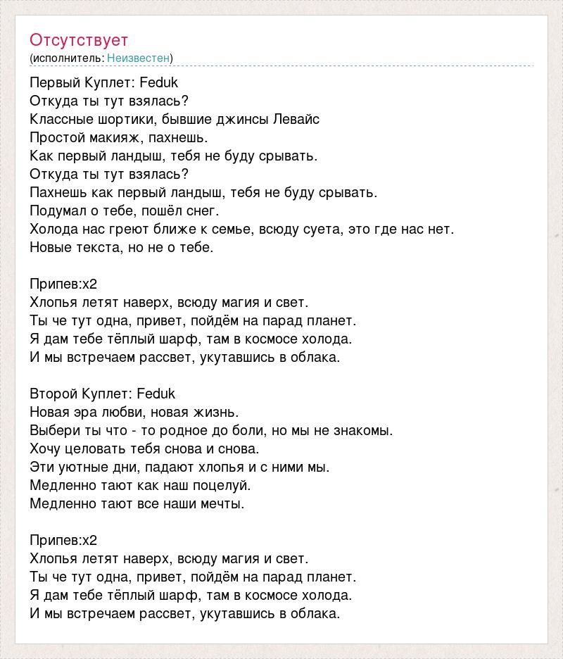 Первый Куплет: Feduk Откуда ты тут взялась? Классные шортики, бывшие джинсы Левайс Простой макияж, пахнешь. Как первый ландыш, тебя не буду срывать. Откуда ты тут взялась? Пахнешь как первый ландыш, тебя не буду срывать. Подумал о тебе, пошёл снег. Холода нас греют ближе к семье, всюду суета, это где нас нет. Новые текста, но не о тебе. Припев:х2 Хлопья летят наверх, всюду магия и свет. Ты че тут одна, привет, пойдём на парад планет. Я дам тебе тёплый шарф, там в космосе холода. И мы встречаем рассвет, укутавшись в облака. Второй Куплет: Feduk Новая эра любви, новая жизнь. Выбери ты что - то родное до боли, но мы не знакомы. Хочу целовать тебя снова и снова. Эти уютные дни, падают хлопья и с ними мы. Медленно тают как наш поцелуй. Медленно тают все наши мечты. Припев:х2 Хлопья летят наверх, всюду магия и свет. Ты че тут одна, привет, пойдём на парад планет. Я дам тебе тёплый шарф, там в космосе холода. И мы встречаем рассвет, укутавшись в облака.