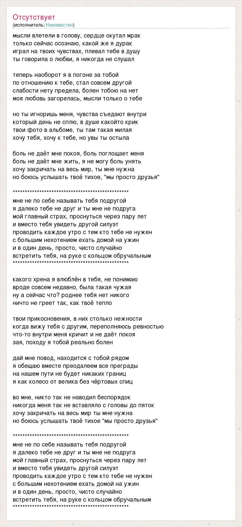 мысли влетели в голову, сердце окутал мрак только сейчас осознаю, какой же я дурак играл на твоих чувствах, плевал тебе в душу ты говорила о любви, я никогда не слушал теперь наоборот я в погоне за тобой по отношению к тебе, стал совсем другой слабости нету предела, болен тобою на нет моя любовь загорелась, мысли только о тебе но ты игноришь меня, чувства съедают внутри который день не сплю, в душе какойто крик твои фото в альбоме, ты там такая милая хочу тебя, хочу к тебе, но увы ты остыла боль не даёт мне покоя, боль поглощает меня боль не даёт мне жить, я не могу боль унять хочу закричать на весь мир, ты мне нужна но боюсь услышать твоё тихое, "мы просто друзья" ************************************************ мне не по себе называть тебя подругой я далеко тебе не друг и ты мне не подруга мой главный страх, проснуться через пару лет и вместо тебя увидеть другой силуэт проводить каждое утро с тем кто тебе не нужен с большим нехотением ехать домой на ужин и в один день, просто, чисто случайно встретить тебя, на руке с кольцом обручальным ************************************************ какого хрена я влюблён в тебя, не понимаю вроде совсем недавно, была такая чужая ну а сейчас что? роднее тебя нет никого ничто не греет так, как твоё тепло твои прикосновения, в них столько нежности когда вижу тебя с другим, переполняюсь ревностью что-то внутри меня кричит и не даёт покоя зая, походу я тобой реально болен дай мне повод, находится с тобой рядом я обещаю вместе преодалеем все преграды на нашем пути не будет никаких границ я как колесо от велика без чёртовых спиц во мне, никто так не наводил беспорядок никогда меня так не вставляло с головы до пяток хочу закричать на весь мир ты мне нужна но боюсь услышать твоё тихое "мы просто друзья" ************************************************ мне не по себе называть тебя подругой я далеко тебе не друг и ты мне не подруга мой главный страх, проснуться через пару лет и вместо тебя увидеть другой силуэт проводить каждое утро с тем кто тебе не нужен с большим нехотением ехать домой на ужин и в один день, просто, чисто случайно встретить тебя, на руке с кольцом обручальным ************************************************
