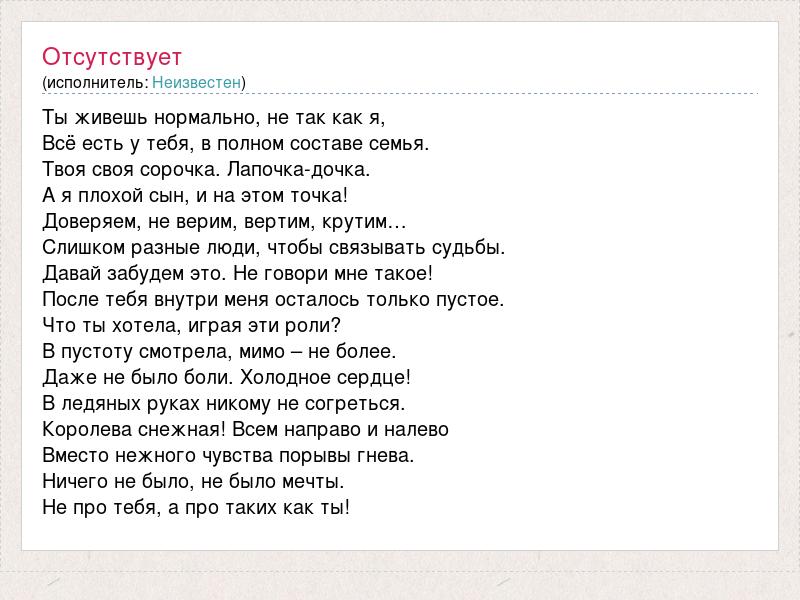 Ты живешь нормально, не так как я, Всё есть у тебя, в полном составе семья. Твоя своя сорочка. Лапочка-дочка. А я плохой сын, и на этом точка! Доверяем, не верим, вертим, крутим… Слишком разные люди, чтобы связывать судьбы. Давай забудем это. Не говори мне такое! После тебя внутри меня осталось только пустое. Что ты хотела, играя эти роли? В пустоту смотрела, мимо – не более. Даже не было боли. Холодное сердце! В ледяных руках никому не согреться. Королева снежная! Всем направо и налево Вместо нежного чувства порывы гнева. Ничего не было, не было мечты. Не про тебя, а про таких как ты!