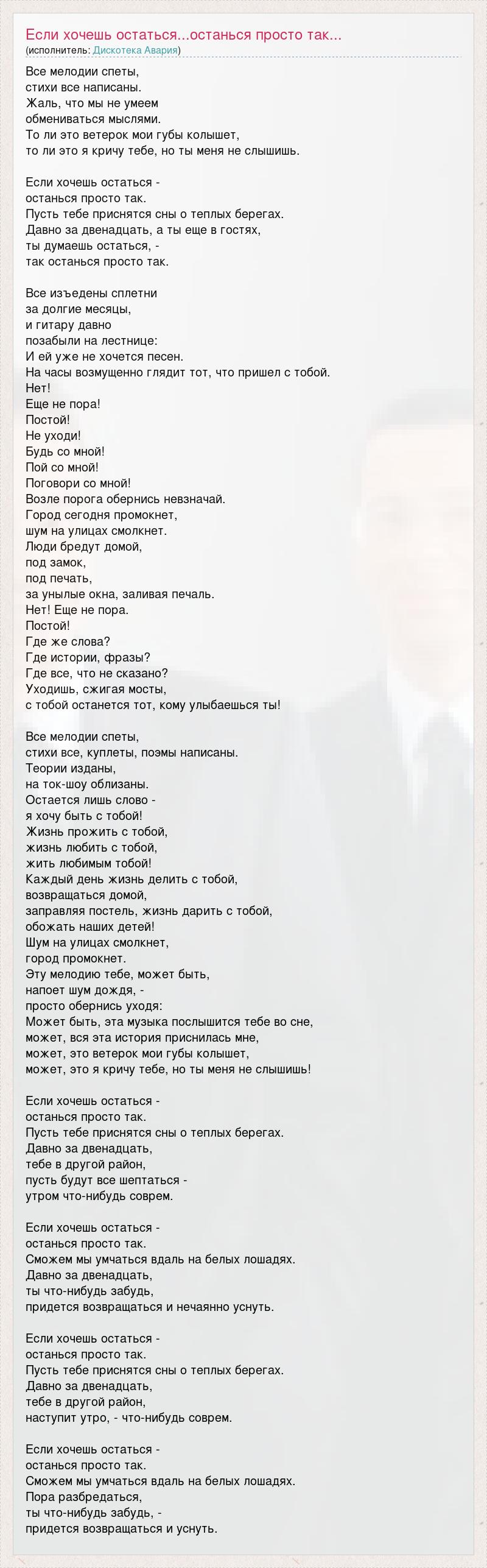 Все мелодии спеты, стихи все написаны. Жаль, что мы не умеем обмениваться мыслями. То ли это ветерок мои губы колышет, то ли это я кричу тебе, но ты меня не слышишь. Если хочешь остаться - останься просто так. Пусть тебе приснятся сны о теплых берегах. Давно за двенадцать, а ты еще в гостях, ты думаешь остаться, - так останься просто так. Все изъедены сплетни за долгие месяцы, и гитару давно позабыли на лестнице: И ей уже не хочется песен. На часы возмущенно глядит тот, что пришел с тобой. Нет! Еще не пора! Постой! Не уходи! Будь со мной! Пой со мной! Поговори со мной! Возле порога обернись невзначай. Город сегодня промокнет, шум на улицах смолкнет. Люди бредут домой, под замок, под печать, за унылые окна, заливая печаль. Нет! Еще не пора. Постой! Где же слова? Где истории, фразы? Где все, что не сказано? Уходишь, сжигая мосты, с тобой останется тот, кому улыбаешься ты! Все мелодии спеты, стихи все, куплеты, поэмы написаны. Теории изданы, на ток-шоу облизаны. Остается лишь слово - я хочу быть с тобой! Жизнь прожить с тобой, жизнь любить с тобой, жить любимым тобой! Каждый день жизнь делить с тобой, возвращаться домой, заправляя постель, жизнь дарить с тобой, обожать наших детей! Шум на улицах смолкнет, город промокнет. Эту мелодию тебе, может быть, напоет шум дождя, - просто обернись уходя: Может быть, эта музыка послышится тебе во сне, может, вся эта история приснилась мне, может, это ветерок мои губы колышет, может, это я кричу тебе, но ты меня не слышишь! Если хочешь остаться - останься просто так. Пусть тебе приснятся сны о теплых берегах. Давно за двенадцать, тебе в другой район, пусть будут все шептаться - утром что-нибудь соврем. Если хочешь остаться - останься просто так. Сможем мы умчаться вдаль на белых лошадях. Давно за двенадцать, ты что-нибудь забудь, придется возвращаться и нечаянно уснуть. Если хочешь остаться - останься просто так. Пусть тебе приснятся сны о теплых берегах. Давно за двенадцать, тебе в другой район, наступит утро, - что-нибудь соврем. Если хочешь остаться - останься просто так. Сможем мы умчаться вдаль на белых лошадях. Пора разбредаться, ты что-нибудь забудь, - придется возвращаться и уснуть.