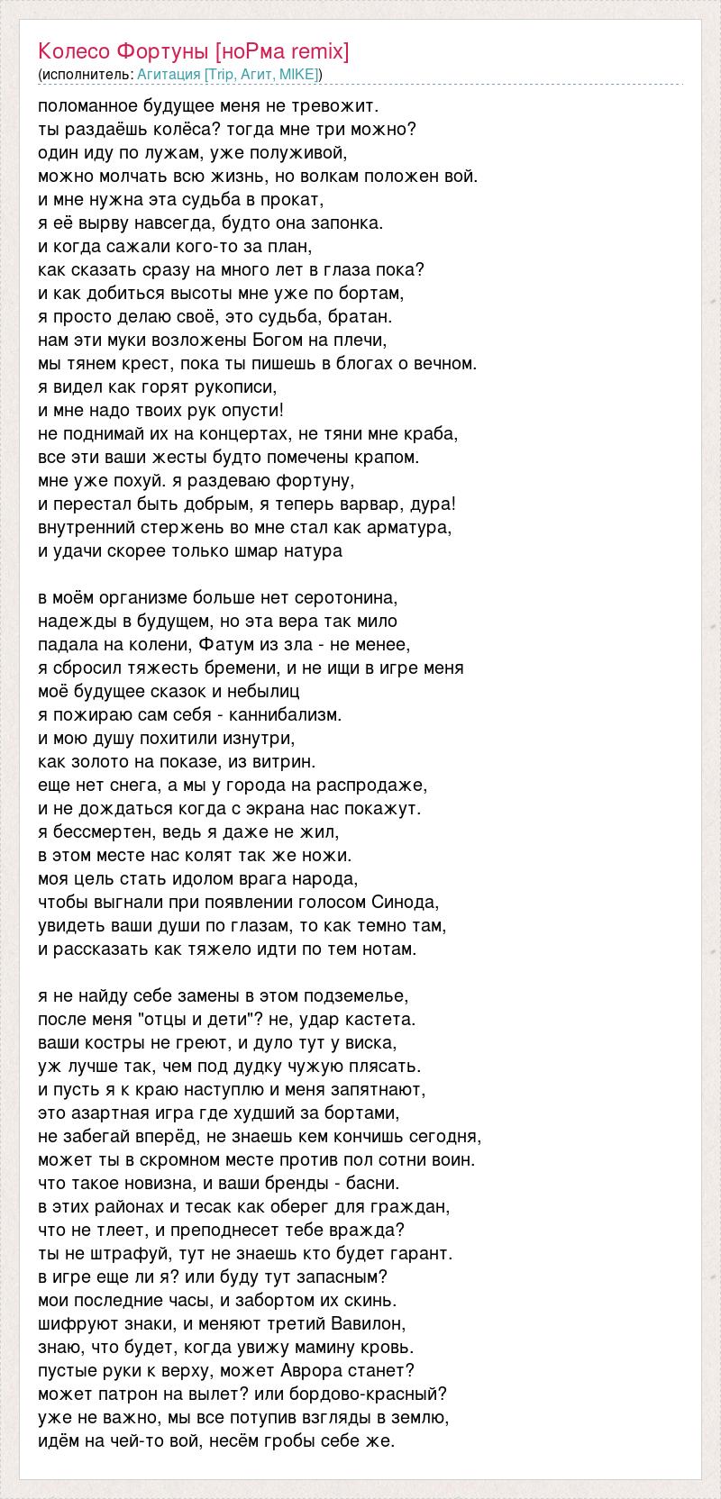 поломанное будущее меня не тревожит. ты раздаёшь колёса? тогда мне три можно? один иду по лужам, уже полуживой, можно молчать всю жизнь, но волкам положен вой. и мне нужна эта судьба в прокат, я её вырву навсегда, будто она запонка. и когда сажали кого-то за план, как сказать сразу на много лет в глаза пока? и как добиться высоты мне уже по бортам, я просто делаю своё, это судьба, братан. нам эти муки возложены Богом на плечи, мы тянем крест, пока ты пишешь в блогах о вечном. я видел как горят рукописи, и мне надо твоих рук опусти! не поднимай их на концертах, не тяни мне краба, все эти ваши жесты будто помечены крапом. мне уже похуй. я раздеваю фортуну, и перестал быть добрым, я теперь варвар, дура! внутренний стержень во мне стал как арматура, и удачи скорее только шмар натура в моём организме больше нет серотонина, надежды в будущем, но эта вера так мило падала на колени, Фатум из зла - не менее, я сбросил тяжесть бремени, и не ищи в игре меня моё будущее сказок и небылиц я пожираю сам себя - каннибализм. и мою душу похитили изнутри, как золото на показе, из витрин. еще нет снега, а мы у города на распродаже, и не дождаться когда с экрана нас покажут. я бессмертен, ведь я даже не жил, в этом месте нас колят так же ножи. моя цель стать идолом врага народа, чтобы выгнали при появлении голосом Синода, увидеть ваши души по глазам, то как темно там, и рассказать как тяжело идти по тем нотам. я не найду себе замены в этом подземелье, после меня "отцы и дети"? не, удар кастета. ваши костры не греют, и дуло тут у виска, уж лучше так, чем под дудку чужую плясать. и пусть я к краю наступлю и меня запятнают, это азартная игра где худший за бортами, не забегай вперёд, не знаешь кем кончишь сегодня, может ты в скромном месте против пол сотни воин. что такое новизна, и ваши бренды - басни. в этих районах и тесак как оберег для граждан, что не тлеет, и преподнесет тебе вражда? ты не штрафуй, тут не знаешь кто будет гарант. в игре еще ли я? или буду тут запасным? мои последние часы, и забортом их скинь. шифруют знаки, и меняют третий Вавилон, знаю, что будет, когда увижу мамину кровь. пустые руки к верху, может Аврора станет? может патрон на вылет? или бордово-красный? уже не важно, мы все потупив взгляды в землю, идём на чей-то вой, несём гробы себе же.