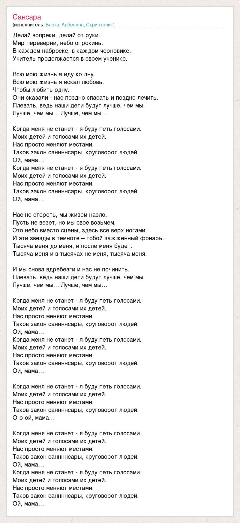 Делай вопреки, делай от руки. Мир переверни, небо опрокинь. В каждом наброске, в каждом черновике. Учитель продолжается в своем ученике. Всю мою жизнь я иду ко дну. Всю мою жизнь я искал любовь. Чтобы любить одну. Они сказали - нас поздно спасать и поздно лечить. Плевать, ведь наши дети будут лучше, чем мы. Лучше, чем мы… Лучше, чем мы… Когда меня не станет - я буду петь голосами. Моих детей и голосами их детей. Нас просто меняют местами. Таков закон саннннсары, круговорот людей. Ой, мама… Когда меня не станет - я буду петь голосами. Моих детей и голосами их детей. Нас просто меняют местами. Таков закон саннннсары, круговорот людей. Ой, мама… Нас не стереть, мы живем назло. Пусть не везет, но мы свое возьмем. Это небо вместо сцены, здесь все верх ногами. И эти звезды в темноте – тобой зажженный фонарь. Тысяча меня до меня, и после меня будет. Тысяча меня и в тысячах не меня, тысяча меня. И мы снова вдребезги и нас не починить. Плевать, ведь наши дети будут лучше, чем мы. Лучше, чем мы… Лучше, чем мы… Когда меня не станет - я буду петь голосами. Моих детей и голосами их детей. Нас просто меняют местами. Таков закон саннннсары, круговорот людей. Ой, мама… Когда меня не станет - я буду петь голосами. Моих детей и голосами их детей. Нас просто меняют местами. Таков закон саннннсары, круговорот людей. Ой, мама… Когда меня не станет - я буду петь голосами. Моих детей и голосами их детей. Нас просто меняют местами. Таков закон саннннсары, круговорот людей. О-о-ой, мама… Когда меня не станет - я буду петь голосами. Моих детей и голосами их детей. Нас просто меняют местами. Таков закон саннннсары, круговорот людей. Ой, мама… Когда меня не станет - я буду петь голосами. Моих детей и голосами их детей. Нас просто меняют местами. Таков закон саннннсары, круговорот людей. Ой, мама…