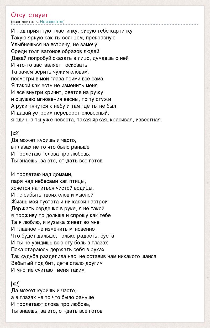 И под приятную пластинку, рисую тебе картинку Такую яркую как ты солнцем, прекрасную Улыбнешься на встречу, не замечу Среди толп вагонов образов людей, Давай попробуй сказать в лицо, думаешь о ней И что-то заставляет тосковать Та зачем верить чужим словам, посмотри в мои глаза пойми все сама, Я такой как есть не изменить меня И все внутри кричит, рвется на ружу и ощущаю мгновения весны, по ту стужи А руки тянутся к небу и там где ты не был И давай устроим переворот словесный, я один, а ты уже невеста, такая яркая, красивая, известная [x2] Да может куришь и часто, в глазах не то что было раньше И пролетают слова про любовь, Ты знаешь, за это, от-дать все готов И пролетаю над домами, паря над небесами как птицы, хочется напиться чистой водицы, И не забыть твоих слов и мыслей Жизнь моя пустота и ни какой настрой Держать сердечко в руке, я не такой я проживу по дольше и спрошу как тебе Та я люблю, и музыка живет во мне И главное не изменить мгновенно Что будет дальше, только радость, суета И ты не увидишь всю эту боль в глазах Пока стараюсь держать себя в руках Так судьба разделила нас, не оставив нам никакого шанса Забытый под бит, дете стало другим И многие считают меня таким [x2] Да может куришь и часто, а в глазах не то что было раньше И пролетают слова про любовь, Ты знаешь, за это, от-дать все готов