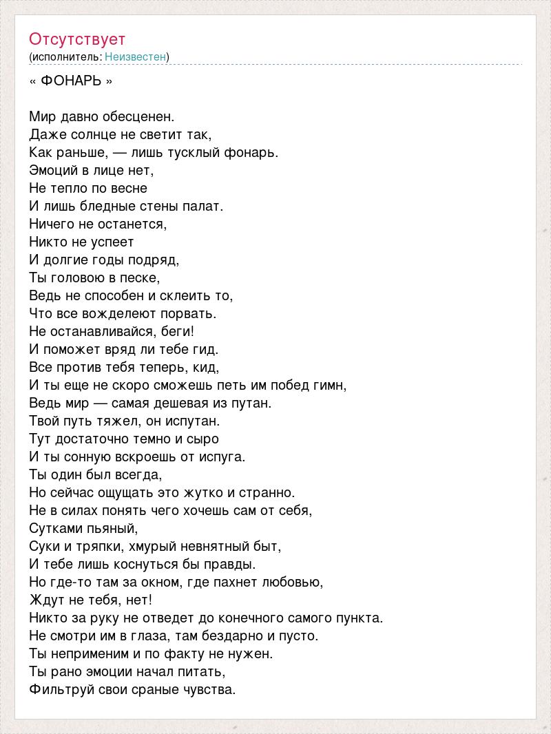 « ФОНАРЬ » Мир давно обесценен. Даже солнце не светит так, Как раньше, — лишь тусклый фонарь. Эмоций в лице нет, Не тепло по весне И лишь бледные стены палат. Ничего не останется, Никто не успеет И долгие годы подряд, Ты головою в песке, Ведь не способен и склеить то, Что все вожделеют порвать. Не останавливайся, беги! И поможет вряд ли тебе гид. Все против тебя теперь, кид, И ты еще не скоро сможешь петь им побед гимн, Ведь мир — самая дешевая из путан. Твой путь тяжел, он испутан. Тут достаточно темно и сыро И ты сонную вскроешь от испуга. Ты один был всегда, Но сейчас ощущать это жутко и странно. Не в силах понять чего хочешь сам от себя, Сутками пьяный, Суки и тряпки, хмурый невнятный быт, И тебе лишь коснуться бы правды. Но где-то там за окном, где пахнет любовью, Ждут не тебя, нет! Никто за руку не отведет до конечного самого пункта. Не смотри им в глаза, там бездарно и пусто. Ты неприменим и по факту не нужен. Ты рано эмоции начал питать, Фильтруй свои сраные чувства.