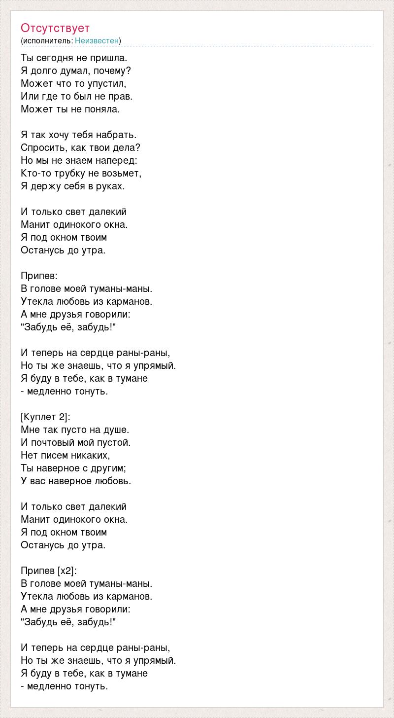 Ты сегодня не пришла. Я долго думал, почему? Может что то упустил, Или где то был не прав. Может ты не поняла. Я так хочу тебя набрать. Спросить, как твои дела? Но мы не знаем наперед: Кто-то трубку не возьмет, Я держу себя в руках. И только свет далекий Манит одинокого окна. Я под окном твоим Останусь до утра. Припев: В голове моей туманы-маны. Утекла любовь из карманов. А мне друзья говорили: "Забудь её, забудь!" И теперь на сердце раны-раны, Но ты же знаешь, что я упрямый. Я буду в тебе, как в тумане - медленно тонуть. [Куплет 2]: Мне так пусто на душе. И почтовый мой пустой. Нет писем никаких, Ты наверное с другим; У вас наверное любовь. И только свет далекий Манит одинокого окна. Я под окном твоим Останусь до утра. Припев [x2]: В голове моей туманы-маны. Утекла любовь из карманов. А мне друзья говорили: "Забудь её, забудь!" И теперь на сердце раны-раны, Но ты же знаешь, что я упрямый. Я буду в тебе, как в тумане - медленно тонуть.