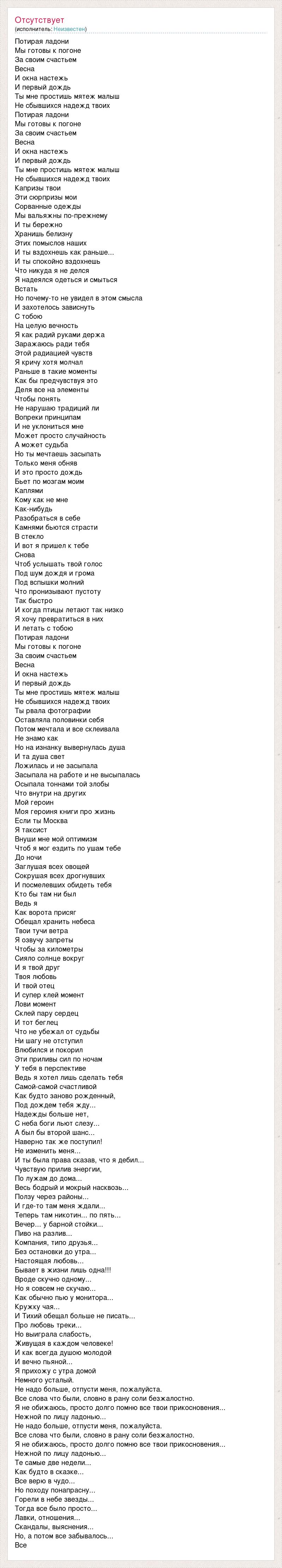 Потирая ладони Мы готовы к погоне За своим счастьем Весна И окна настежь И первый дождь Ты мне простишь мятеж малыш Не сбывшихся надежд твоих Потирая ладони Мы готовы к погоне За своим счастьем Весна И окна настежь И первый дождь Ты мне простишь мятеж малыш Не сбывшихся надежд твоих Капризы твои Эти сюрпризы мои Сорванные одежды Мы вальяжны по-прежнему И ты бережно Хранишь белизну Этих помыслов наших И ты вздохнешь как раньше... И ты спокойно вздохнешь Что никуда я не делся Я надеялся одеться и смыться Встать Но почему-то не увидел в этом смысла И захотелось зависнуть С тобою На целую вечность Я как радий руками держа Заражаюсь ради тебя Этой радиацией чувств Я кричу хотя молчал Раньше в такие моменты Как бы предчувствуя это Деля все на элементы Чтобы понять Не нарушаю традиций ли Вопреки принципам И не уклониться мне Может просто случайность А может судьба Но ты мечтаешь засыпать Только меня обняв И это просто дождь Бьет по мозгам моим Каплями Кому как не мне Как-нибудь Разобраться в себе Камнями бьются страсти В стекло И вот я пришел к тебе Снова Чтоб услышать твой голос Под шум дождя и грома Под вспышки молний Что пронизывают пустоту Так быстро И когда птицы летают так низко Я хочу превратиться в них И летать с тобою Потирая ладони Мы готовы к погоне За своим счастьем Весна И окна настежь И первый дождь Ты мне простишь мятеж малыш Не сбывшихся надежд твоих Ты рвала фотографии Оставляла половинки себя Потом мечтала и все склеивала Не знамо как Но на изнанку вывернулась душа И та душа свет Ложилась и не засыпала Засыпала на работе и не высыпалась Осыпала тоннами той злобы Что внутри на других Мой героин Моя героиня книги про жизнь Если ты Москва Я таксист Внуши мне мой оптимизм Чтоб я мог ездить по ушам тебе До ночи Заглушая всех овощей Сокрушая всех дрогнувших И посмелевших обидеть тебя Кто бы там ни был Ведь я Как ворота присяг Обещал хранить небеса Твои тучи ветра Я озвучу запреты Чтобы за километры Сияло солнце вокруг И я твой друг Твоя любовь И твой отец И супер клей момент Лови момент Склей пару сердец И тот беглец Что не убежал от судьбы Ни шагу не отступил Влюбился и покорил Эти приливы сил по ночам У тебя в перспективе Ведь я хотел лишь сделать тебя Самой-самой счастливой Как будто заново рожденный, Под дождем тебя жду... Надежды больше нет, С неба боги льют слезу... А был бы второй шанс... Наверно так же поступил! Не изменить меня... И ты была права сказав, что я дебил... Чувствую прилив энергии, По лужам до дома... Весь бодрый и мокрый насквозь... Ползу через районы... И где-то там меня ждали... Теперь там никотин... по пять... Вечер... у барной стойки... Пиво на разлив... Компания, типо друзья... Без остановки до утра... Настоящая любовь... Бывает в жизни лишь одна!!! Вроде скучно одному... Но я совсем не скучаю... Как обычно пью у монитора... Кружку чая... И Тихий обещал больше не писать... Про любовь треки... Но выиграла слабость, Живущая в каждом человеке! И как всегда душою молодой И вечно пьяной... Я прихожу с утра домой Немного усталый. Не надо больше, отпусти меня, пожалуйста. Все слова что были, словно в рану соли безжалостно. Я не обижаюсь, просто долго помню все твои прикосновения... Нежной по лицу ладонью... Не надо больше, отпусти меня, пожалуйста. Все слова что были, словно в рану соли безжалостно. Я не обижаюсь, просто долго помню все твои прикосновения.