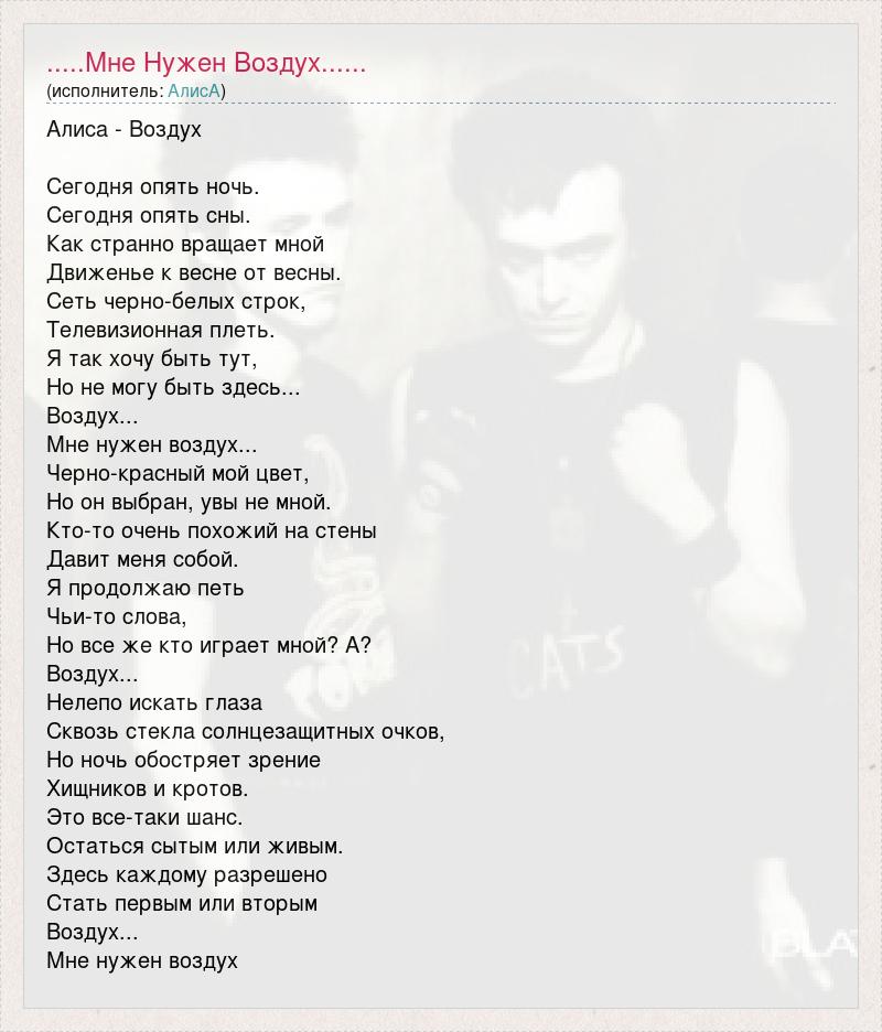 Алиса - Воздух Сегодня опять ночь. Сегодня опять сны. Как странно вращает мной Движенье к весне от весны. Сеть черно-белых строк, Телевизионная плеть. Я так хочу быть тут, Но не могу быть здесь... Воздух... Мне нужен воздух... Черно-красный мой цвет, Но он выбран, увы не мной. Кто-то очень похожий на стены Давит меня собой. Я продолжаю петь Чьи-то слова, Но все же кто играет мной? А? Воздух... Нелепо искать глаза Сквозь стекла солнцезащитных очков, Но ночь обостряет зрение Хищников и кротов. Это все-таки шанс. Остаться сытым или живым. Здесь каждому разрешено Стать первым или вторым Воздух... Мне нужен воздух