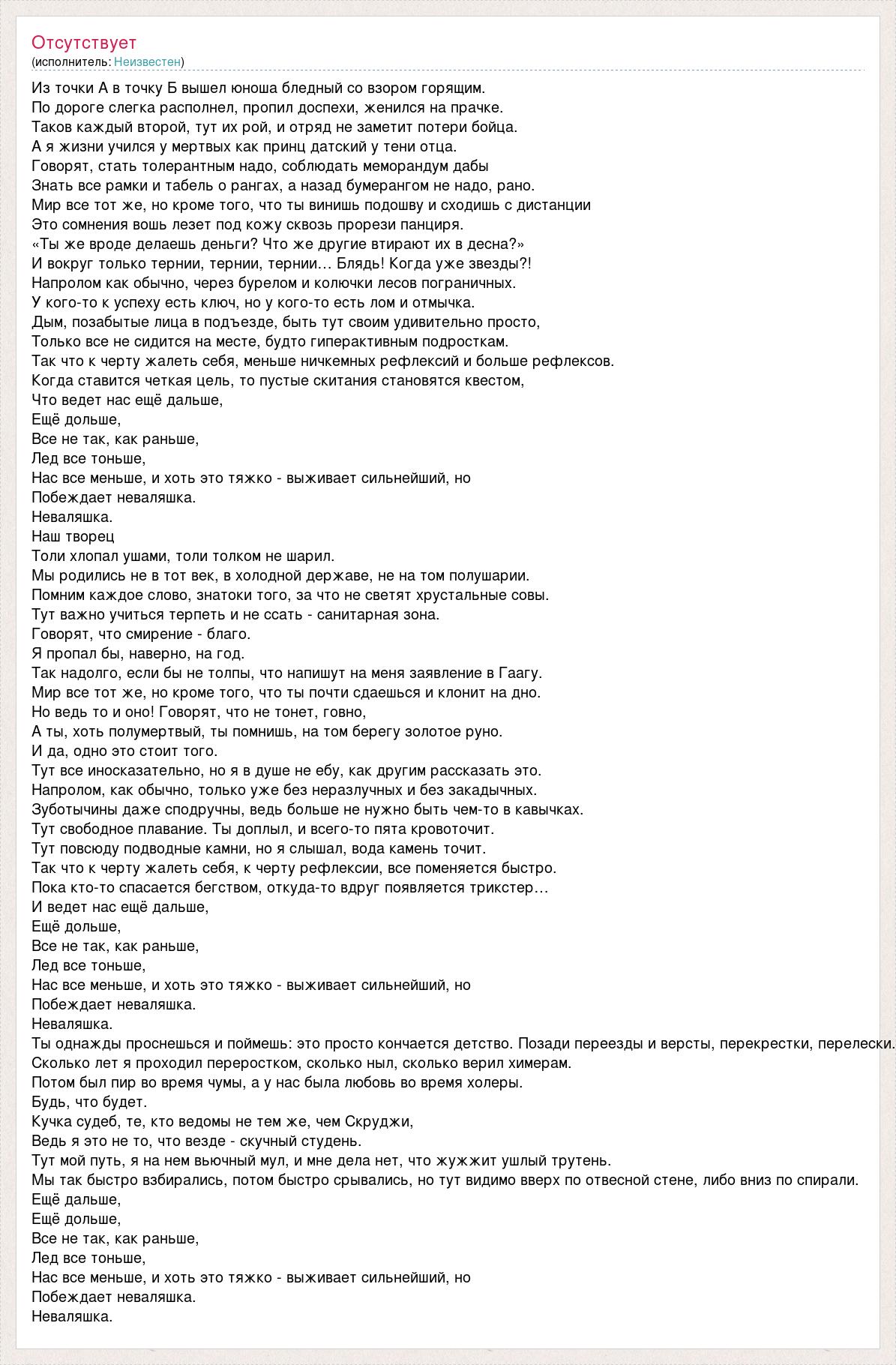 Из точки А в точку Б вышел юноша бледный со взором горящим. По дороге слегка располнел, пропил доспехи, женился на прачке. Таков каждый второй, тут их рой, и отряд не заметит потери бойца. А я жизни учился у мертвых как принц датский у тени отца. Говорят, стать толерантным надо, соблюдать меморандум дабы Знать все рамки и табель о рангах, а назад бумерангом не надо, рано. Мир все тот же, но кроме того, что ты винишь подошву и сходишь с дистанции Это сомнения вошь лезет под кожу сквозь прорези панциря. «Ты же вроде делаешь деньги? Что же другие втирают их в десна?» И вокруг только тернии, тернии, тернии… Блядь! Когда уже звезды?! Напролом как обычно, через бурелом и колючки лесов пограничных. У кого-то к успеху есть ключ, но у кого-то есть лом и отмычка. Дым, позабытые лица в подъезде, быть тут своим удивительно просто, Только все не сидится на месте, будто гиперактивным подросткам. Так что к черту жалеть себя, меньше ничкемных рефлексий и больше рефлексов. Когда ставится четкая цель, то пустые скитания становятся квестом, Что ведет нас ещё дальше, Ещё дольше, Все не так, как раньше, Лед все тоньше, Нас все меньше, и хоть это тяжко - выживает сильнейший, но Побеждает неваляшка. Неваляшка. Наш творец Толи хлопал ушами, толи толком не шарил. Мы родились не в тот век, в холодной державе, не на том полушарии. Помним каждое слово, знатоки того, за что не светят хрустальные совы. Тут важно учиться терпеть и не ссать - санитарная зона. Говорят, что смирение - благо. Я пропал бы, наверно, на год. Так надолго, если бы не толпы, что напишут на меня заявление в Гаагу. Мир все тот же, но кроме того, что ты почти сдаешься и клонит на дно. Но ведь то и оно! Говорят, что не тонет, говно, А ты, хоть полумертвый, ты помнишь, на том берегу золотое руно. И да, одно это стоит того. Тут все иносказательно, но я в душе не ебу, как другим рассказать это. Напролом, как обычно, только уже без неразлучных и без закадычных. Зуботычины даже сподручны, ведь больше не нужно быть чем-то в кавычках. Тут свободное плавание. Ты доплыл, и всего-то пята кровоточит. Тут повсюду подводные камни, но я слышал, вода камень точит. Так что к черту жалеть себя, к черту рефлексии, все поменяется быстро. Пока кто-то спасается бегством, откуда-то вдруг появляется трикстер… И ведет нас ещё дальше, Ещё дольше, Все не так, как раньше, Лед все тоньше, Нас все меньше, и хоть это тяжко - выживает сильнейший, но Побеждает неваляшка. Неваляшка. Ты однажды проснешься и поймешь: это просто кончается детство. Позади переезды и версты, перекрестки, перелески. Сколько лет я проходил переростком, сколько ныл, сколько верил химерам. Потом был пир во время чумы, а у нас была любовь во время холеры. Будь, что будет. Кучка судеб, те, кто ведомы не тем же, чем Скруджи, Ведь я это не то, что везде - скучный студень. Тут мой путь, я на нем вьючный мул, и мне дела нет, что жужжит ушлый трутень. Мы так быстро взбирались, потом быстро срывались, но тут видимо вверх по отвесной стене, либо вниз по спирали. Ещё дальше, Ещё дольше, Все не так, как раньше, Лед все тоньше, Нас все меньше, и хоть это тяжко - выживает сильнейший, но Побеждает неваляшка. Неваляшка.