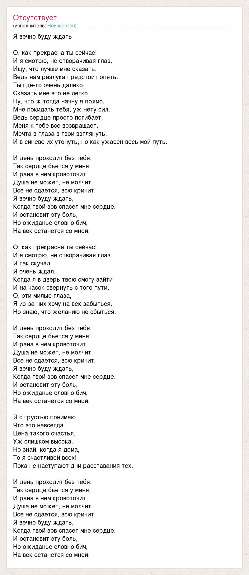 Я вечно буду ждать О, как прекрасна ты сейчас! И я смотрю, не отворачивая глаз. Ищу, что лучше мне сказать. Ведь нам разлука предстоит опять. Ты где-то очень далеко, Сказать мне это не легко. Ну, что ж тогда начну я прямо, Мне покидать тебя, уж нету сил. Ведь сердце просто погибает, Меня к тебе все возвращает. Мечта в глаза в твои взглянуть. И в синеве их утонуть, но как ужасен весь мой путь. И день проходит без тебя. Так сердце бьется у меня. И рана в нем кровоточит, Душа не может, не молчит. Все не сдается, всю кричит. Я вечно буду ждать, Когда твой зов спасет мне сердце. И остановит эту боль, Но ожиданье словно бич, На век останется со мной. О, как прекрасна ты сейчас! И я смотрю, не отворачивая глаз. Я так скучал. Я очень ждал. Когда я в дверь твою смогу зайти И на часок свернуть с того пути. О, эти милые глаза, Я из-за них хочу на век забыться. Но знаю, что желанию не сбыться. И день проходит без тебя. Так сердце бьется у меня. И рана в нем кровоточит, Душа не может, не молчит. Все не сдается, всю кричит. Я вечно буду ждать, Когда твой зов спасет мне сердце. И остановит эту боль, Но ожиданье словно бич, На век останется со мной. Я с грустью понимаю Что это навсегда. Цена такого счастья, Уж слишком высока. Но знай, когда я дома, То я счастливей всех! Пока не наступают дни расставания тех. И день проходит без тебя. Так сердце бьется у меня. И рана в нем кровоточит, Душа не может, не молчит. Все не сдается, всю кричит. Я вечно буду ждать, Когда твой зов спасет мне сердце. И остановит эту боль, Но ожиданье словно бич, На век останется со мной.