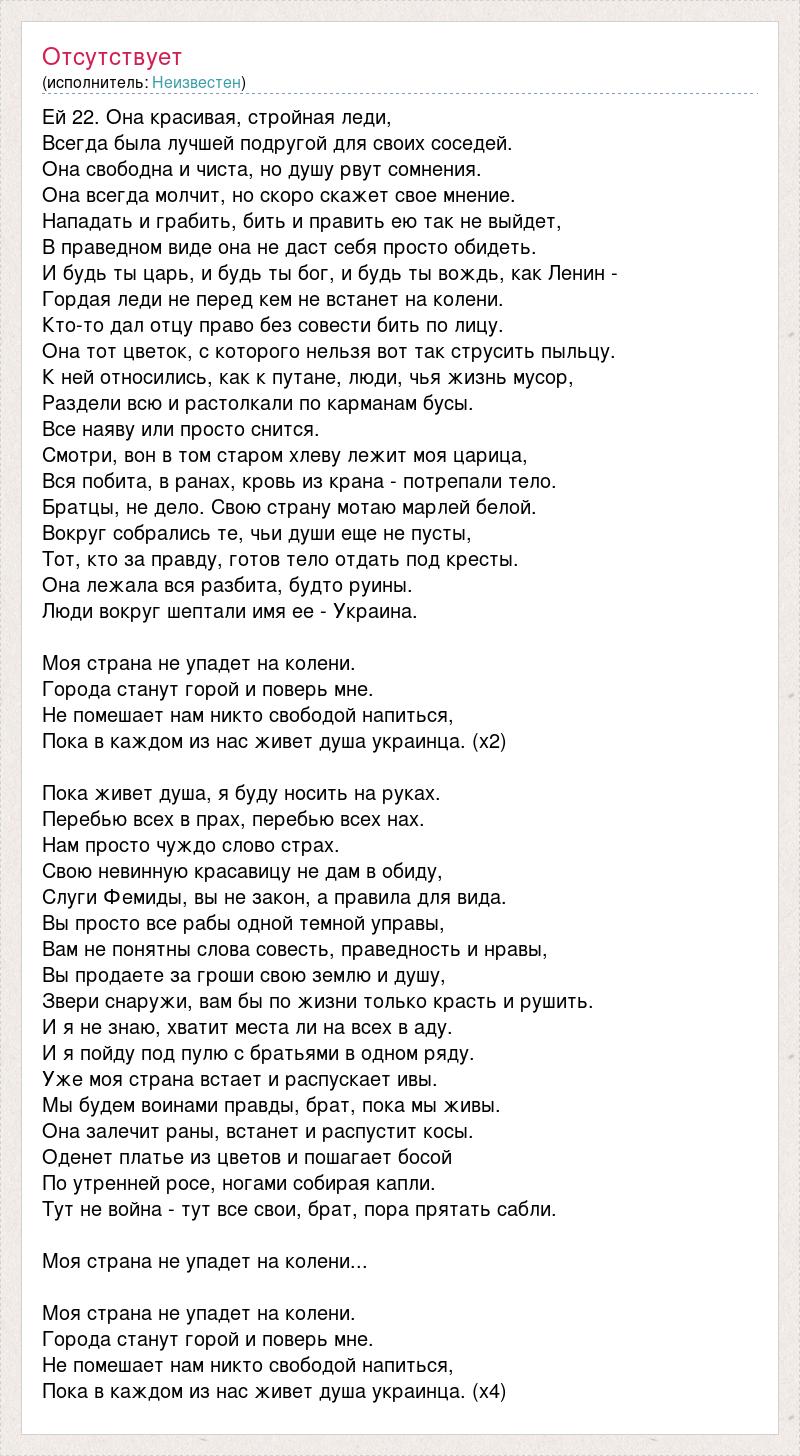 Ей 22. Она красивая, стройная леди, Всегда была лучшей подругой для своих соседей. Она свободна и чиста, но душу рвут сомнения. Она всегда молчит, но скоро скажет свое мнение. Нападать и грабить, бить и править ею так не выйдет, В праведном виде она не даст себя просто обидеть. И будь ты царь, и будь ты бог, и будь ты вождь, как Ленин - Гордая леди не перед кем не встанет на колени. Кто-то дал отцу право без совести бить по лицу. Она тот цветок, с которого нельзя вот так струсить пыльцу. К ней относились, как к путане, люди, чья жизнь мусор, Раздели всю и растолкали по карманам бусы. Все наяву или просто снится. Смотри, вон в том старом хлеву лежит моя царица, Вся побита, в ранах, кровь из крана - потрепали тело. Братцы, не дело. Свою страну мотаю марлей белой. Вокруг собрались те, чьи души еще не пусты, Тот, кто за правду, готов тело отдать под кресты. Она лежала вся разбита, будто руины. Люди вокруг шептали имя ее - Украина. Моя страна не упадет на колени. Города станут горой и поверь мне. Не помешает нам никто свободой напиться, Пока в каждом из нас живет душа украинца. (x2) Пока живет душа, я буду носить на руках. Перебью всех в прах, перебью всех нах. Нам просто чуждо слово страх. Свою невинную красавицу не дам в обиду, Слуги Фемиды, вы не закон, а правила для вида. Вы просто все рабы одной темной управы, Вам не понятны слова совесть, праведность и нравы, Вы продаете за гроши свою землю и душу, Звери снаружи, вам бы по жизни только красть и рушить. И я не знаю, хватит места ли на всех в аду. И я пойду под пулю с братьями в одном ряду. Уже моя страна встает и распускает ивы. Мы будем воинами правды, брат, пока мы живы. Она залечит раны, встанет и распустит косы. Оденет платье из цветов и пошагает босой По утренней росе, ногами собирая капли. Тут не война - тут все свои, брат, пора прятать сабли. Моя страна не упадет на колени... Моя страна не упадет на колени. Города станут горой и поверь мне. Не помешает нам никто свободой напиться, Пока в каждом из нас живет душа украинца. (x4)