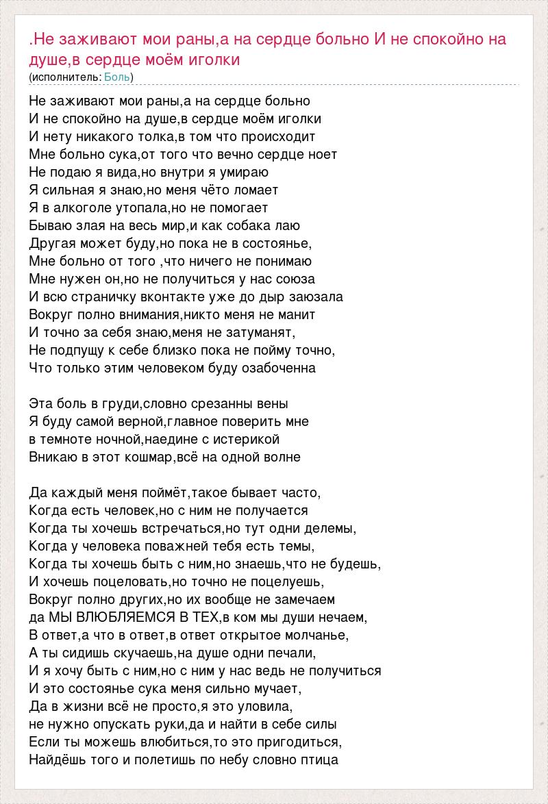 Не заживают мои раны,а на сердце больно И не спокойно на душе,в сердце моём иголки И нету никакого толка,в том что происходит Мне больно сука,от того что вечно сердце ноет Не подаю я вида,но внутри я умираю Я сильная я знаю,но меня чёто ломает Я в алкоголе утопала,но не помогает Бываю злая на весь мир,и как собака лаю Другая может буду,но пока не в состоянье, Мне больно от того ,что ничего не понимаю Мне нужен он,но не получиться у нас союза И всю страничку вконтакте уже до дыр заюзала Вокруг полно внимания,никто меня не манит И точно за себя знаю,меня не затуманят, Не подпущу к себе близко пока не пойму точно, Что только этим человеком буду озабоченна Эта боль в груди,словно срезанны вены Я буду самой верной,главное поверить мне в темноте ночной,наедине с истерикой Вникаю в этот кошмар,всё на одной волне Да каждый меня поймёт,такое бывает часто, Когда есть человек,но с ним не получается Когда ты хочешь встречаться,но тут одни делемы, Когда у человека поважней тебя есть темы, Когда ты хочешь быть с ним,но знаешь,что не будешь, И хочешь поцеловать,но точно не поцелуешь, Вокруг полно других,но их вообще не замечаем да МЫ ВЛЮБЛЯЕМСЯ В ТЕХ,в ком мы души нечаем, В ответ,а что в ответ,в ответ открытое молчанье, А ты сидишь скучаешь,на душе одни печали, И я хочу быть с ним,но с ним у нас ведь не получиться И это состоянье сука меня сильно мучает, Да в жизни всё не просто,я это уловила, не нужно опускать руки,да и найти в себе силы Если ты можешь влюбиться,то это пригодиться, Найдёшь того и полетишь по небу словно птица