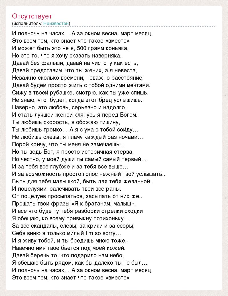 И полночь на часах… А за окном весна, март месяц Это всем тем, кто знает что такое «вместе» И может быть это не я, 500 грамм коньяка, Но это то, что я хочу сказать наверняка. Давай без фальши, давай на чистоту как есть, Давай представим, что ты жених, а я невеста, Неважно сколько времени, неважно расстояние, Давай будем просто жить с тобой одними мечтами. Сижу в твоей рубашке, смотрю, как ты уже спишь, Не знаю, что будет, когда этот бред услышишь. Наверно, это любовь, серьезно и надолго, И стать лучшей женой клянусь я перед Богом. Ты любишь скорость, я обожаю тишину, Ты любишь громко… А я с ума с тобой сойду… Не любишь слезы, я плачу каждый раз ночами… Порой кричу, что ты меня не замечаешь… Но ты ведь Бог, я просто истеричная стерва, Но честно, у моей души ты самый самый первый… И за тебя все глубже и за тебя все выше… И за возможность просто голос нежный твой услышать.. Быть для тебя малышкой, быть для тебя желанной, И поцелуями залечивать твои все раны. От поцелуев просыпаться, засыпать от них же.. Прощать твои фразы «Я к братанам, малыш». И все что будет у тебя разборки стрелки сходки Я обещаю, ко всему привыкну потихоньку… За все скандалы, слезы, за крики и за ссоры, Себя виню я только милый I’m so sorry… И я живу тобой, и ты бредишь мною тоже, Навечно имя твое бьется под моей кожей. Давай беречь то, что подарило нам небо, Я обещаю быть рядом, как бы далеко ты не был… И полночь на часах… А за окном весна, март месяц Это всем тем, кто знает что такое «вместе»
