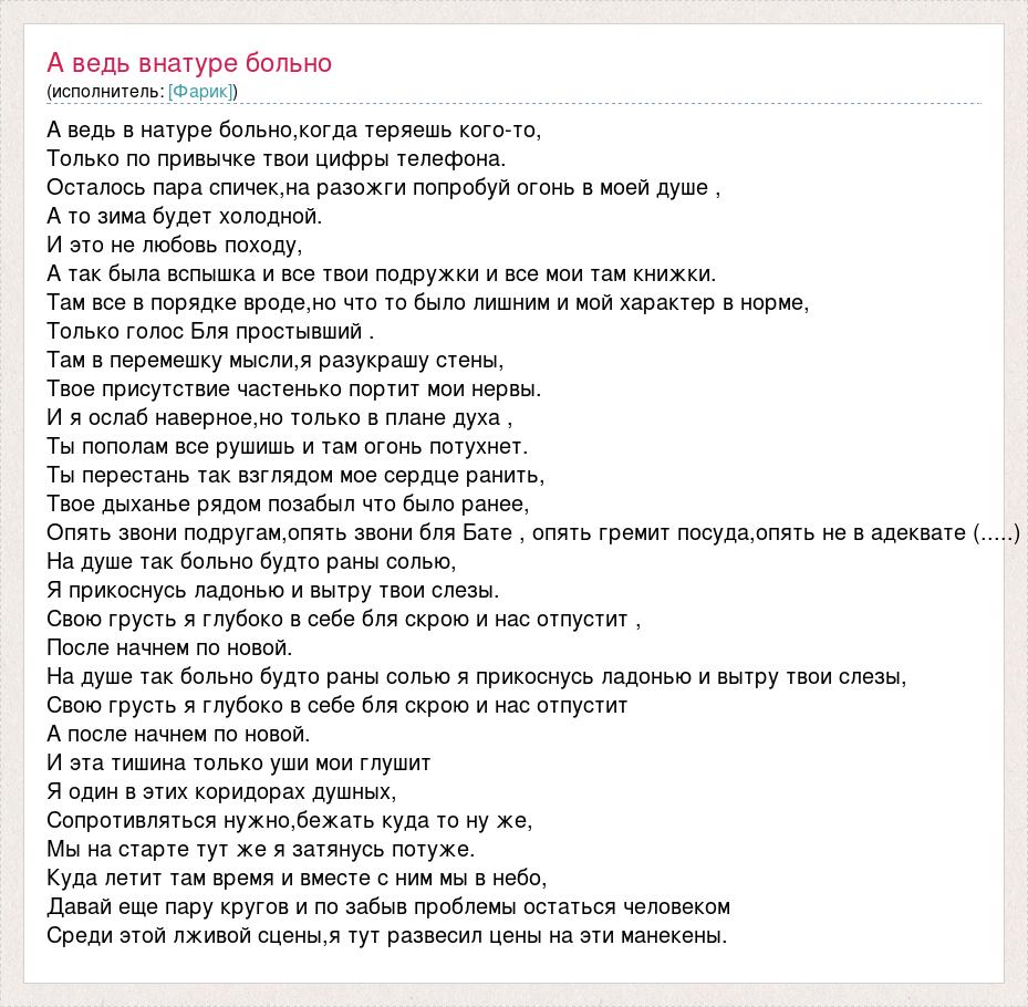А ведь в натуре больно,когда теряешь кого-то, Только по привычке твои цифры телефона. Осталось пара спичек,на разожги попробуй огонь в моей душе , А то зима будет холодной. И это не любовь походу, А так была вспышка и все твои подружки и все мои там книжки. Там все в порядке вроде,но что то было лишним и мой характер в норме, Только голос Бля простывший . Там в перемешку мысли,я разукрашу стены, Твое присутствие частенько портит мои нервы. И я ослаб наверное,но только в плане духа , Ты пополам все рушишь и там огонь потухнет. Ты перестань так взглядом мое сердце ранить, Твое дыханье рядом позабыл что было ранее, Опять звони подругам,опять звони бля Бате , опять гремит посуда,опять не в адеквате (.....) На душе так больно будто раны солью, Я прикоснусь ладонью и вытру твои слезы. Свою грусть я глубоко в себе бля скрою и нас отпустит , После начнем по новой. На душе так больно будто раны солью я прикоснусь ладонью и вытру твои слезы, Свою грусть я глубоко в себе бля скрою и нас отпустит А после начнем по новой. И эта тишина только уши мои глушит Я один в этих коридорах душных, Сопротивляться нужно,бежать куда то ну же, Мы на старте тут же я затянусь потуже. Куда летит там время и вместе с ним мы в небо, Давай еще пару кругов и по забыв проблемы остаться человеком Среди этой лживой сцены,я тут развесил цены на эти манекены.