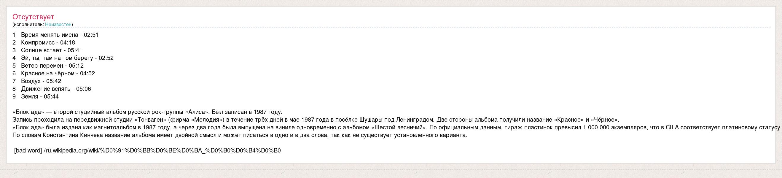 1 Время менять имена - 02:51 2 Компромисс - 04:18 3 Солнце встаёт - 05:41 4 Эй, ты, там на том берегу - 02:52 5 Ветер перемен - 05:12 6 Красное на чёрном - 04:52 7 Воздух - 05:42 8 Движение вспять - 05:06 9 Земля - 05:44 «Блок ада» — второй студийный альбом русской рок-группы «Алиса». Был записан в 1987 году. Запись проходила на передвижной студии «Тонваген» (фирма «Мелодия») в течение трёх дней в мае 1987 года в посёлке Шушары под Ленинградом. Две стороны альбома получили название «Красное» и «Чёрное». «Блок ада» была издана как магнитоальбом в 1987 году, а через два года была выпущена на виниле одновременно с альбомом «Шестой лесничий». По официальным данным, тираж пластинок превысил 1 000 000 экземпляров, что в США соответствует платиновому статусу. По словам Константина Кинчева название альбома имеет двойной смысл и может писаться в одно и в два слова, так как не существует установленного варианта. [bad word] /ru.wikipedia.org/wiki/%D0%91%D0%BB%D0%BE%D0%BA_%D0%B0%D0%B4%D0%B0