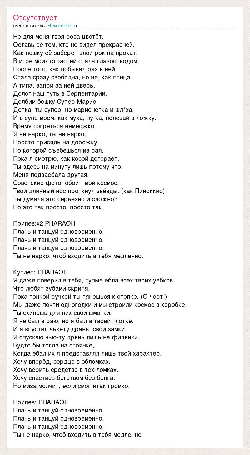 Не для меня твоя роза цветёт. Оставь её тем, кто не видел прекрасней. Как пешку её заберет злой рок на прокат. В игре моих страстей стала глазоотводом. После того, как побывал раз в ней. Стала сразу свободна, но не, как птица. А типа, запри за ней дверь. Долог наш путь в Серпентарии. Долбим бошку Супер Марио. Детка, ты супер, но марионетка и шл*ха. И в супе моем, как муха, ну-ка, полезай в ложку. Время согреться немножко. Я не нарко, ты не нарко. Просто присядь на дорожку. По которой съебешься из рая. Пока я смотрю, как косой догорает. Ты здесь на минуту лишь потому что. Меня подзаебала другая. Советские фото, обои - мой космос. Твой длинный нос проткнул звёзды. (как Пиноккио) Ты думала это серьезно и сложно? Но это так просто, просто так. Припев:х2 PHARAOH Плачь и танцуй одновременно. Плачь и танцуй одновременно. Плачь и танцуй одновременно. Ты не нарко, чтоб входить в тебя медленно. Куплет: PHARAOH Я даже поверил в тебя, тупые ёбла всех твоих уебков. Что любят зубами скрипя. Пока тонкой ручкой ты тянешься к стопке. (О черт!) Мы даже почти одногодки и мы строили космос в коробке. Ты скинешь для них свои шмотки. Я не был в раю, но я был в твоей глотке. И я впустил чью-ту дрянь, свои замки. Я спускаю чью-ту дрянь лишь на филянки. Будто бы тогда на стоянке, Когда ебал их я представлял лишь твой характер. Хочу вперёд, сердце в обломках. Хочу верить средство в тех ломках. Хочу спастись бегством без бонга. Но миза молчит, если смог итак громко. Припев: PHARAOH Плачь и танцуй одновременно. Плачь и танцуй одновременно. Плачь и танцуй одновременно. Ты не нарко, чтоб входить в тебя медленно