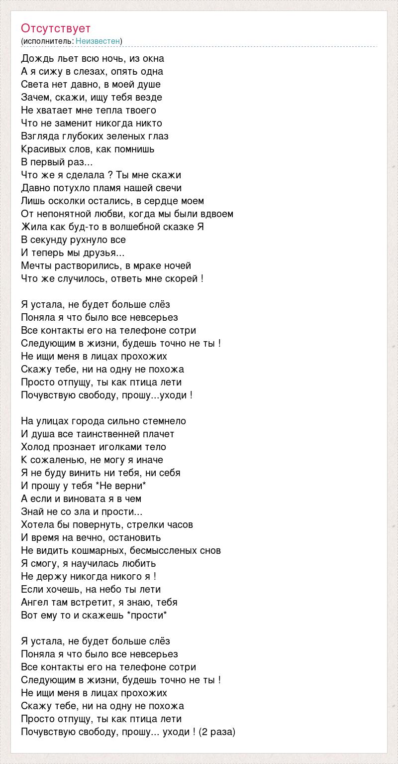 Дождь льет всю ночь, из окна А я сижу в слезах, опять одна Света нет давно, в моей душе Зачем, скажи, ищу тебя везде Не хватает мне тепла твоего Что не заменит никогда никто Взгляда глубоких зеленых глаз Красивых слов, как помнишь В первый раз... Что же я сделала ? Ты мне скажи Давно потухло пламя нашей свечи Лишь осколки остались, в сердце моем От непонятной любви, когда мы были вдвоем Жила как буд-то в волшебной сказке Я В секунду рухнуло все И теперь мы друзья... Мечты растворились, в мраке ночей Что же случилось, ответь мне скорей ! Я устала, не будет больше слёз Поняла я что было все невсерьез Все контакты его на телефоне сотри Следующим в жизни, будешь точно не ты ! Не ищи меня в лицах прохожих Скажу тебе, ни на одну не похожа Просто отпущу, ты как птица лети Почувствую свободу, прошу...уходи ! На улицах города сильно стемнело И душа все таинственней плачет Холод прознает иголками тело К сожаленью, не могу я иначе Я не буду винить ни тебя, ни себя И прошу у тебя *Не верни* А если и виновата я в чем Знай не со зла и прости... Хотела бы повернуть, стрелки часов И время на вечно, остановить Не видить кошмарных, бесмыссленых снов Я смогу, я научилась любить Не держу никогда никого я ! Если хочешь, на небо ты лети Ангел там встретит, я знаю, тебя Вот ему то и скажешь *прости* Я устала, не будет больше слёз Поняла я что было все невсерьез Все контакты его на телефоне сотри Следующим в жизни, будешь точно не ты ! Не ищи меня в лицах прохожих Скажу тебе, ни на одну не похожа Просто отпущу, ты как птица лети Почувствую свободу, прошу... уходи ! (2 раза)
