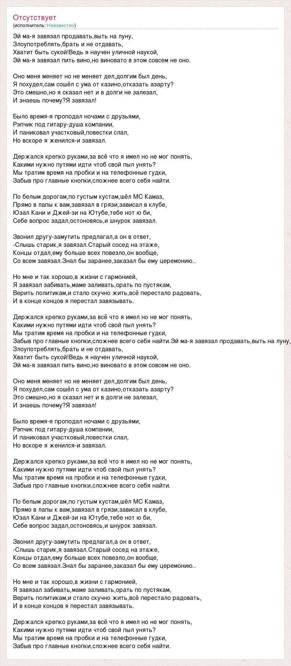 Эй ма-я завязал продавать,выть на луну, Злоупотреблять,брать и не отдавать, Хватит быть сукой!Ведь я научен уличной наукой, Эй ма-я завязал пить вино,но виновато в этом совсем не оно. Оно меня меняет но не меняет дел,долгим был день, Я похудел,сам сошёл с ума от казино,отказать азарту? Это смешно,но я сказал нет и в долги не залезал, И знаешь почему?Я завязал! Было время-я проподал ночами с друзьями, Рэпчик под гитару-душа компании, И паниковал участковый,повестки слал, Но вскоре я женился-и завязал. Держался крепко руками,за всё что я имел но не мог понять, Какими нужно путями идти чтоб свой пыл унять? Мы тратим время на пробки и на телефонные гудки, Забыв про главные кнопки,сложнее всего себя найти. По белым дорогам,по густым кустам,шёл МС Камаз, Прямо в лапы к вам,завязал в грязи,зависал в клубе, Юзал Кани и Джей-зи на Ютубе,тебе нот ю би, Себе вопрос задал,остоновясь,и шнурок завязал. Звонил другу-замутить предлагал,а он в ответ, -Слышь старик,я завязал.Старый сосед на этаже, Концы отдал,ему больше всех повезло,он вообще, Со всем завязал.Знал бы заранее,заказал бы ему церемонию.. Но мне и так хорошо,в жизни с гармонией, Я завязал забивать,маме заливать,орать по пустякам, Верить политикам,и стало скучно жить,всё перестало радовать, И в конце концов я перестал завязывать. Держался крепко руками,за всё что я имел но не мог понять, Какими нужно путями идти чтоб свой пыл унять? Мы тратим время на пробки и на телефонные гудки, Забыв про главные кнопки,сложнее всего себя найти.Эй ма-я завязал продавать,выть на луну, Злоупотреблять,брать и не отдавать, Хватит быть сукой!Ведь я научен уличной наукой, Эй ма-я завязал пить вино,но виновато в этом совсем не оно. Оно меня меняет но не меняет дел,долгим был день, Я похудел,сам сошёл с ума от казино,отказать азарту? Это смешно,но я сказал нет и в долги не залезал, И знаешь почему?Я завязал! Было время-я проподал ночами с друзьями, Рэпчик под гитару-душа компании, И паниковал участковый,повестки слал, Но вскоре я женился-и завязал. Держался крепко руками,за всё что я имел но не мог понять, Какими нужно путями идти чтоб свой пыл унять? Мы тратим время на пробки и на телефонные гудки, Забыв про главные кнопки,сложнее всего себя найти. По белым дорогам,по густым кустам,шёл МС Камаз, Прямо в лапы к вам,завязал в грязи,зависал в клубе, Юзал Кани и Джей-зи на Ютубе,тебе нот ю би, Себе вопрос задал,остоновясь,и шнурок завязал. Звонил другу-замутить предлагал,а он в ответ, -Слышь старик,я завязал.Старый сосед на этаже, Концы отдал,ему больше всех повезло,он вообще, Со всем завязал.Знал бы заранее,заказал бы ему церемонию.. Но мне и так хорошо,в жизни с гармонией, Я завязал забивать,маме заливать,орать по пустякам, Верить политикам,и стало скучно жить,всё перестало радовать, И в конце концов я перестал завязывать. Держался крепко руками,за всё что я имел но не мог понять, Какими нужно путями идти чтоб свой пыл унять? Мы тратим время на пробки и на телефонные гудки, Забыв про главные кнопки,сложнее всего себя найти.