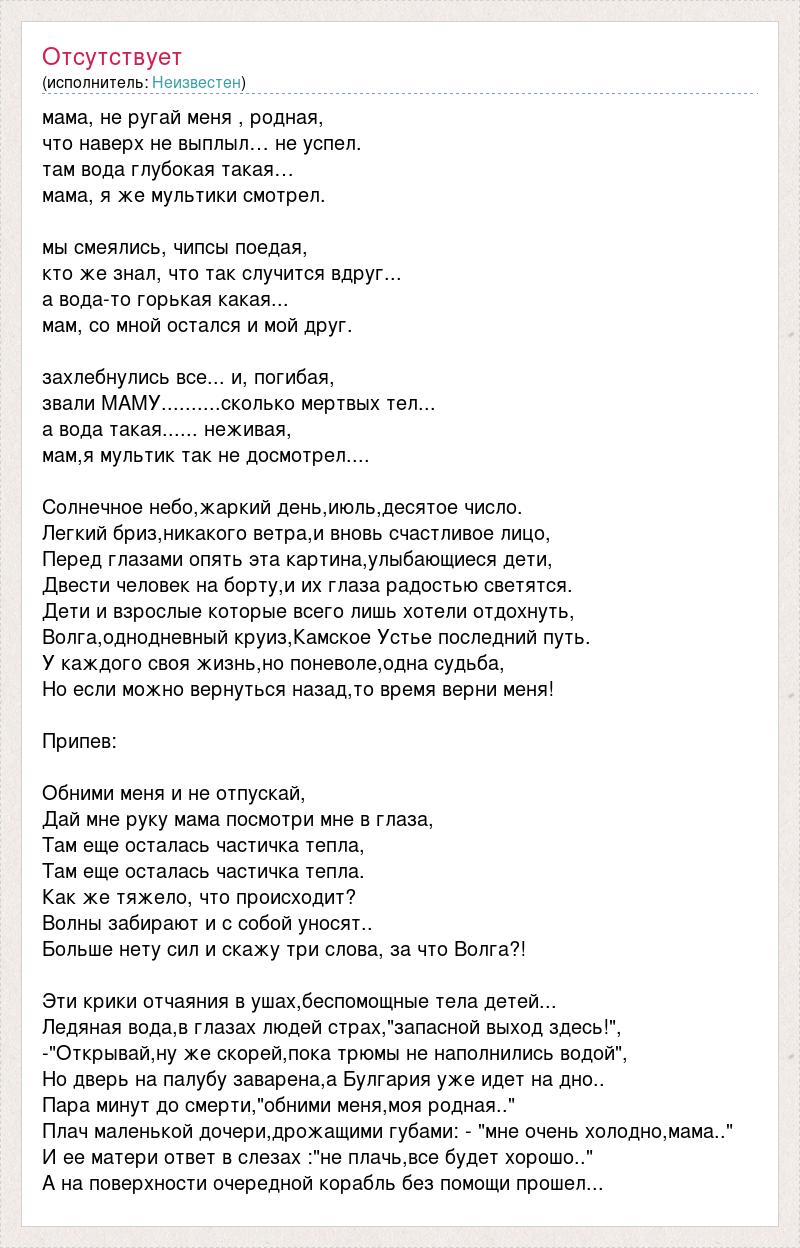 мама, не ругай меня , родная, что наверх не выплыл… не успел. там вода глубокая такая… мама, я же мультики смотрел. мы смеялись, чипсы поедая, кто же знал, что так случится вдруг... а вода-то горькая какая... мам, со мной остался и мой друг. захлебнулись все... и, погибая, звали МАМУ..........сколько мертвых тел... а вода такая...... неживая, мам,я мультик так не досмотрел.... Солнечное небо,жаркий день,июль,десятое число. Легкий бриз,никакого ветра,и вновь счастливое лицо, Перед глазами опять эта картина,улыбающиеся дети, Двести человек на борту,и их глаза радостью светятся. Дети и взрослые которые всего лишь хотели отдохнуть, Волга,однодневный круиз,Камское Устье последний путь. У каждого своя жизнь,но поневоле,одна судьба, Но если можно вернуться назад,то время верни меня! Припев: Обними меня и не отпускай, Дай мне руку мама посмотри мне в глаза, Там еще осталась частичка тепла, Там еще осталась частичка тепла. Как же тяжело, что происходит? Волны забирают и с собой уносят.. Больше нету сил и скажу три слова, за что Волга?! Эти крики отчаяния в ушах,беспомощные тела детей... Ледяная вода,в глазах людей страх,"запасной выход здесь!", -"Открывай,ну же скорей,пока трюмы не наполнились водой", Но дверь на палубу заварена,а Булгария уже идет на дно.. Пара минут до смерти,"обними меня,моя родная.." Плач маленькой дочери,дрожащими губами: - "мне очень холодно,мама.." И ее матери ответ в слезах :"не плачь,все будет хорошо.." А на поверхности очередной корабль без помощи прошел...