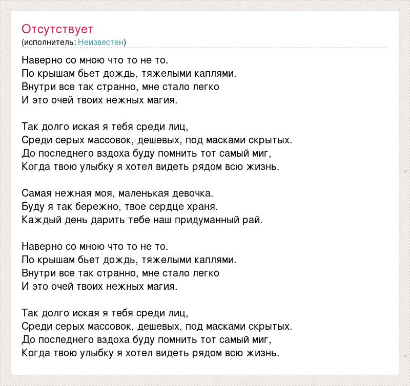 Наверно со мною что то не то. По крышам бьет дождь, тяжелыми каплями. Внутри все так странно, мне стало легко И это очей твоих нежных магия. Так долго иская я тебя среди лиц, Среди серых массовок, дешевых, под масками скрытых. До последнего вздоха буду помнить тот самый миг, Когда твою улыбку я хотел видеть рядом всю жизнь. Самая нежная моя, маленькая девочка. Буду я так бережно, твое сердце храня. Каждый день дарить тебе наш придуманный рай. Наверно со мною что то не то. По крышам бьет дождь, тяжелыми каплями. Внутри все так странно, мне стало легко И это очей твоих нежных магия. Так долго иская я тебя среди лиц, Среди серых массовок, дешевых, под масками скрытых. До последнего вздоха буду помнить тот самый миг, Когда твою улыбку я хотел видеть рядом всю жизнь.