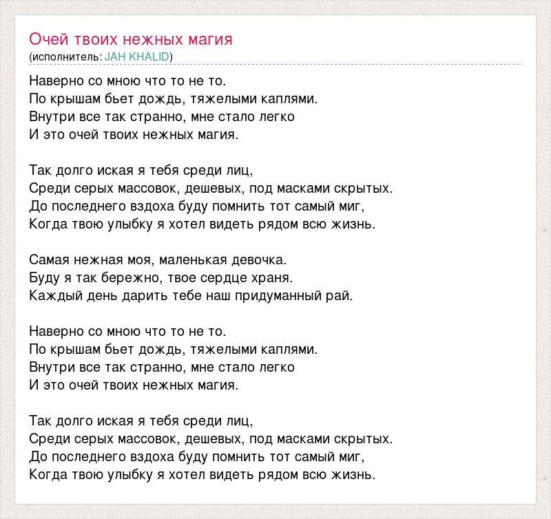 Наверно со мною что то не то. По крышам бьет дождь, тяжелыми каплями. Внутри все так странно, мне стало легко И это очей твоих нежных магия. Так долго иская я тебя среди лиц, Среди серых массовок, дешевых, под масками скрытых. До последнего вздоха буду помнить тот самый миг, Когда твою улыбку я хотел видеть рядом всю жизнь. Самая нежная моя, маленькая девочка. Буду я так бережно, твое сердце храня. Каждый день дарить тебе наш придуманный рай. Наверно со мною что то не то. По крышам бьет дождь, тяжелыми каплями. Внутри все так странно, мне стало легко И это очей твоих нежных магия. Так долго иская я тебя среди лиц, Среди серых массовок, дешевых, под масками скрытых. До последнего вздоха буду помнить тот самый миг, Когда твою улыбку я хотел видеть рядом всю жизнь.