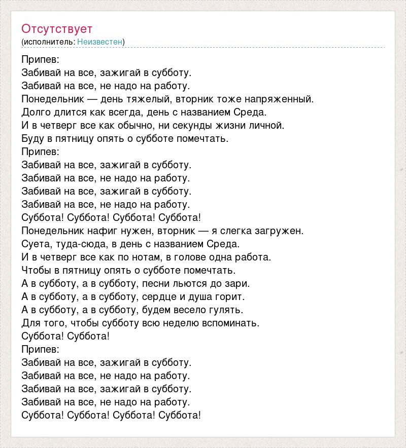Припев: Забивай на все, зажигай в субботу. Забивай на все, не надо на работу. Понедельник — день тяжелый, вторник тоже напряженный. Долго длится как всегда, день с названием Среда. И в четверг все как обычно, ни секунды жизни личной. Буду в пятницу опять о субботе помечтать. Припев: Забивай на все, зажигай в субботу. Забивай на все, не надо на работу. Забивай на все, зажигай в субботу. Забивай на все, не надо на работу. Суббота! Суббота! Суббота! Суббота! Понедельник нафиг нужен, вторник — я слегка загружен. Суета, туда-сюда, в день с названием Среда. И в четверг все как по нотам, в голове одна работа. Чтобы в пятницу опять о субботе помечтать. А в субботу, а в субботу, песни льются до зари. А в субботу, а в субботу, сердце и душа горит. А в субботу, а в субботу, будем весело гулять. Для того, чтобы субботу всю неделю вспоминать. Суббота! Суббота! Припев: Забивай на все, зажигай в субботу. Забивай на все, не надо на работу. Забивай на все, зажигай в субботу. Забивай на все, не надо на работу. Суббота! Суббота! Суббота! Суббота!