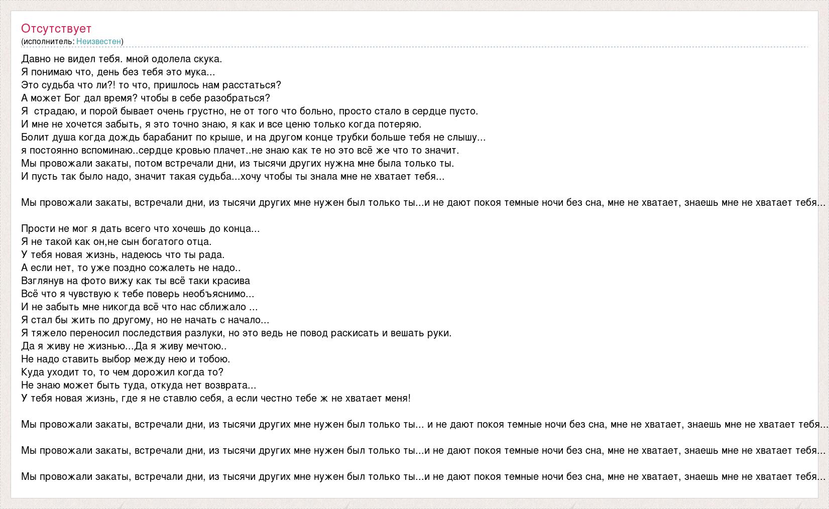 Давно не видел тебя. мной одолела скука. Я понимаю что, день без тебя это мука... Это судьба что ли?! то что, пришлось нам расстаться? А может Бог дал время? чтобы в себе разобраться? Я страдаю, и порой бывает очень грустно, не от того что больно, просто стало в сердце пусто. И мне не хочется забыть, я это точно знаю, я как и все ценю только когда потеряю. Болит душа когда дождь барабанит по крыше, и на другом конце трубки больше тебя не слышу... я постоянно вспоминаю..сердце кровью плачет..не знаю как те но это всё же что то значит. Мы провожали закаты, потом встречали дни, из тысячи других нужна мне была только ты. И пусть так было надо, значит такая судьба...хочу чтобы ты знала мне не хватает тебя... Мы провожали закаты, встречали дни, из тысячи других мне нужен был только ты...и не дают покоя темные ночи без сна, мне не хватает, знаешь мне не хватает тебя... Прости не мог я дать всего что хочешь до конца... Я не такой как он,не сын богатого отца. У тебя новая жизнь, надеюсь что ты рада. А если нет, то уже поздно сожалеть не надо.. Взглянув на фото вижу как ты всё таки красива Всё что я чувствую к тебе поверь необъяснимо... И не забыть мне никогда всё что нас сближало ... Я стал бы жить по другому, но не начать с начало... Я тяжело переносил последствия разлуки, но это ведь не повод раскисать и вешать руки. Да я живу не жизнью...Да я живу мечтою.. Не надо ставить выбор между нею и тобою. Куда уходит то, то чем дорожил когда то? Не знаю может быть туда, откуда нет возврата... У тебя новая жизнь, где я не ставлю себя, а если честно тебе ж не хватает меня! Мы провожали закаты, встречали дни, из тысячи других мне нужен был только ты... и не дают покоя темные ночи без сна, мне не хватает, знаешь мне не хватает тебя... Мы провожали закаты, встречали дни, из тысячи других мне нужен был только ты...и не дают покоя темные ночи без сна, мне не хватает, знаешь мне не хватает тебя... Мы провожали закаты, встречали дни, из тысячи других мне нужен был только ты...и не дают покоя темные ночи без сна, мне не хватает, знаешь мне не хватает тебя...