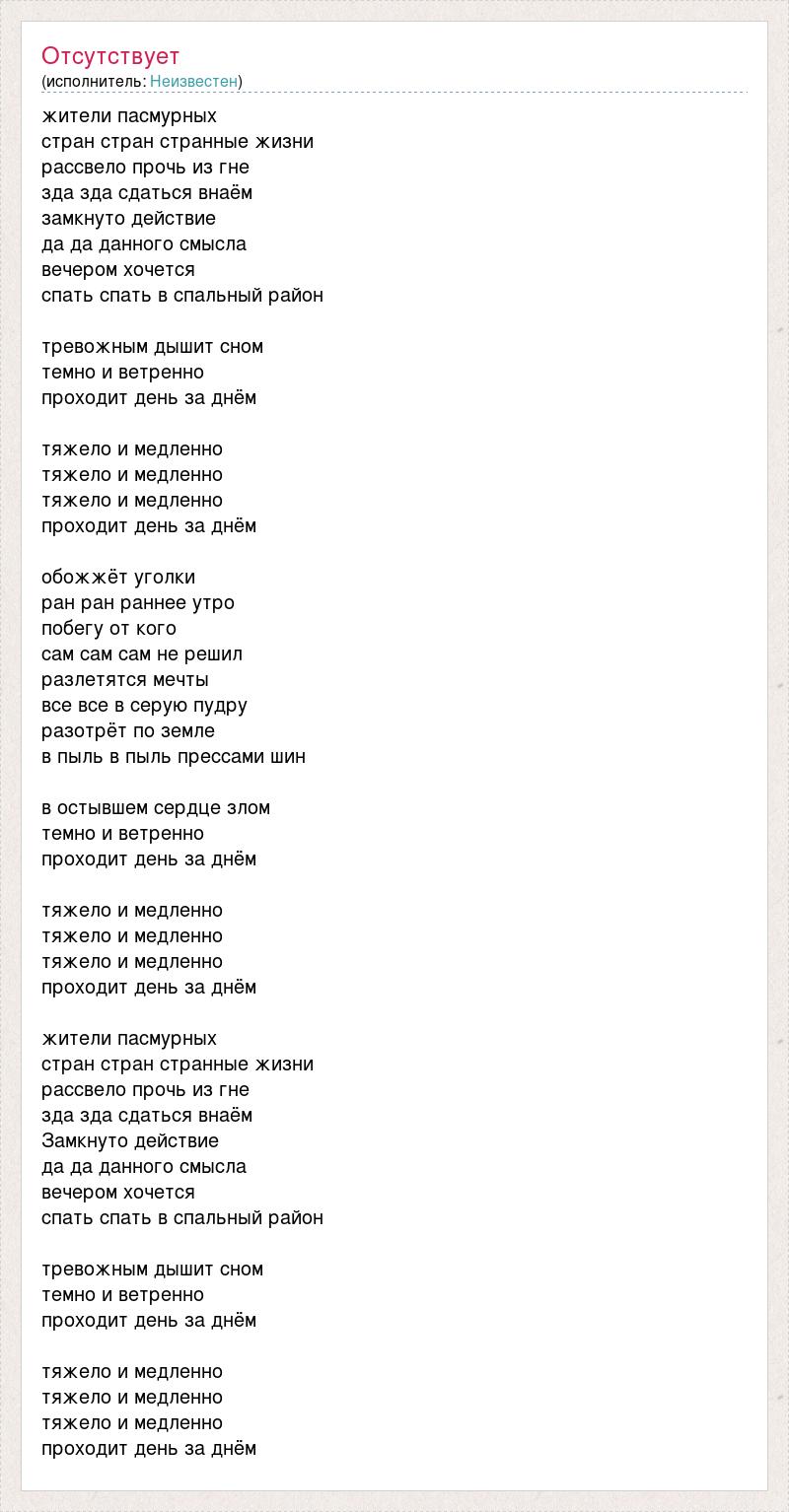 жители пасмурных стран стран странные жизни рассвело прочь из гне зда зда сдаться внаём замкнуто действие да да данного смысла вечером хочется спать спать в спальный район тревожным дышит сном темно и ветренно проходит день за днём тяжело и медленно тяжело и медленно тяжело и медленно проходит день за днём обожжёт уголки ран ран раннее утро побегу от кого сам сам сам не решил разлетятся мечты все все в серую пудру разотрёт по земле в пыль в пыль прессами шин в остывшем сердце злом темно и ветренно проходит день за днём тяжело и медленно тяжело и медленно тяжело и медленно проходит день за днём жители пасмурных стран стран странные жизни рассвело прочь из гне зда зда сдаться внаём Замкнуто действие да да данного смысла вечером хочется спать спать в спальный район тревожным дышит сном темно и ветренно проходит день за днём тяжело и медленно тяжело и медленно тяжело и медленно проходит день за днём